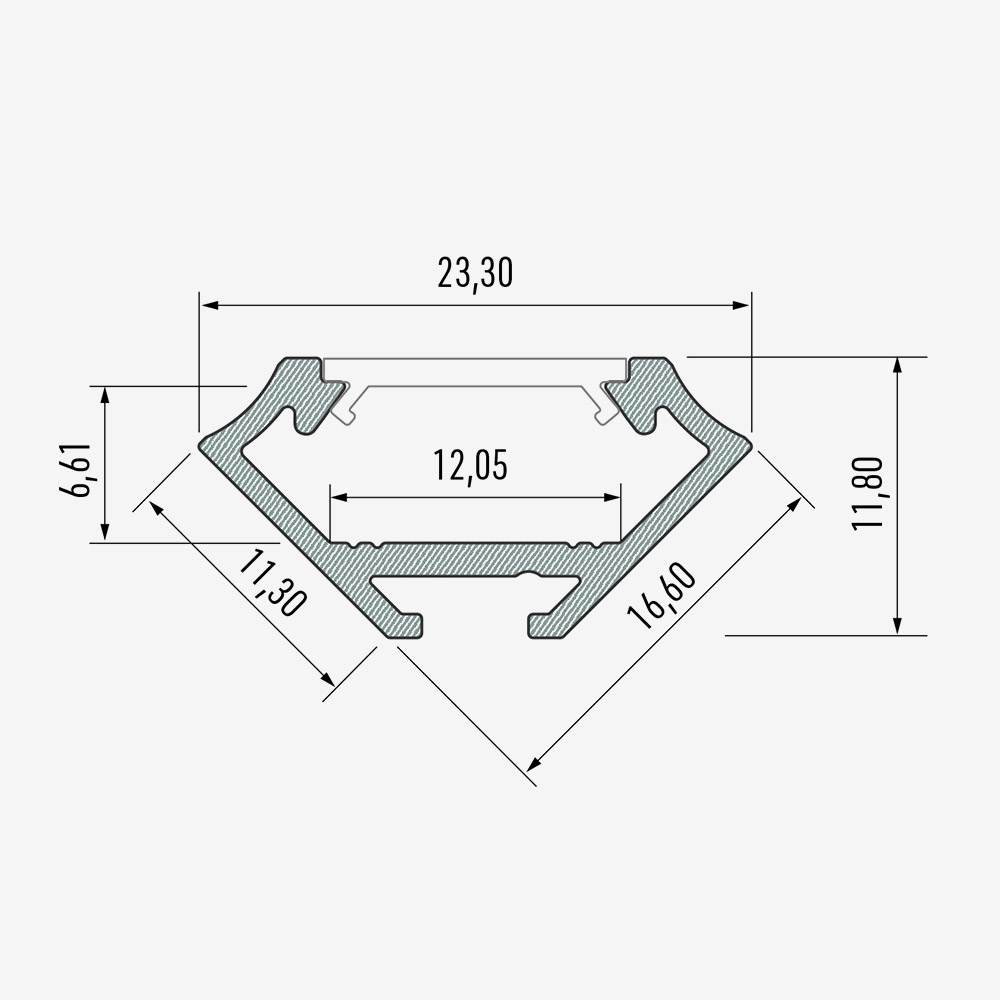 Aluminiumprofil för hörn eller när man vill vinkla ljuset 45grader. Profilen passar alla våra LED-strips med IP-klass IP20 och IP62. Kan användas inomhus och utomhus. Monteras med clips, lim eller dubbelhäftande tejp.