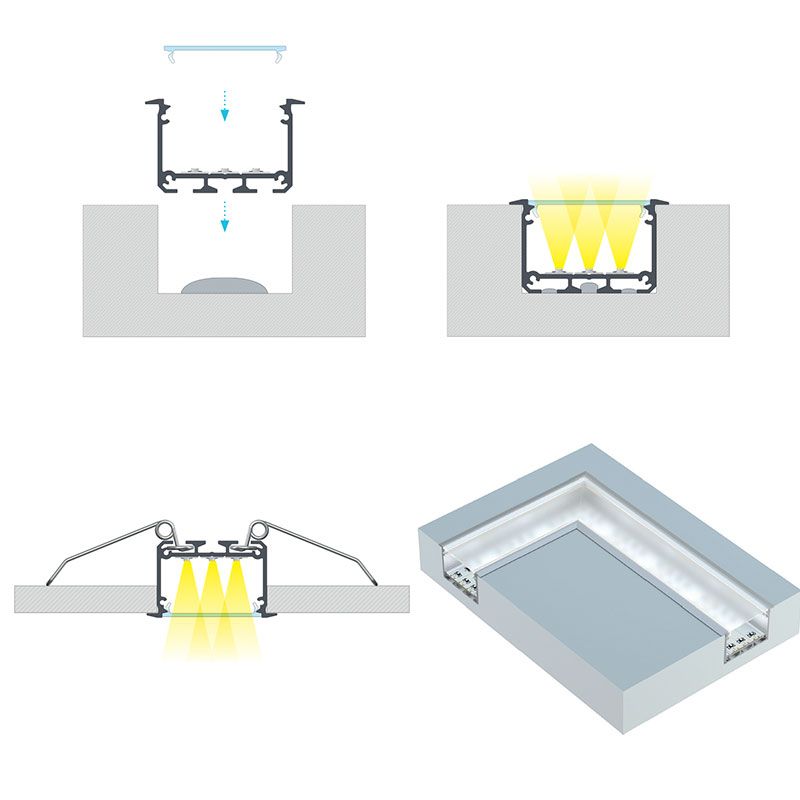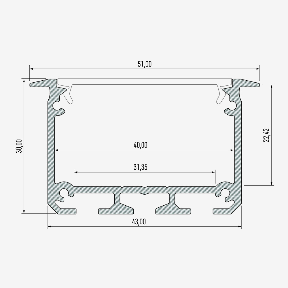 Bred aluminiumprofil för infällt montage. Används för att bygga infällda linjer i tak som skall fungera som allmänbelysning.
