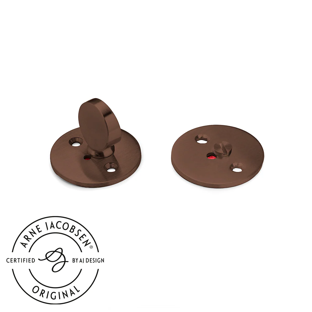 Arne Jacobsen är känd för sina rena designer i slitstarka material och det gäller definitivt detta toalettbeslag, som tillsammans med dörrhandtaget har blivit ett riktigt designikon och varumärke för dansk design. Toalettbeslaget produceras idag av d line, där Arne Jacobsens namn är präglat på sidan av dörrhandtaget.