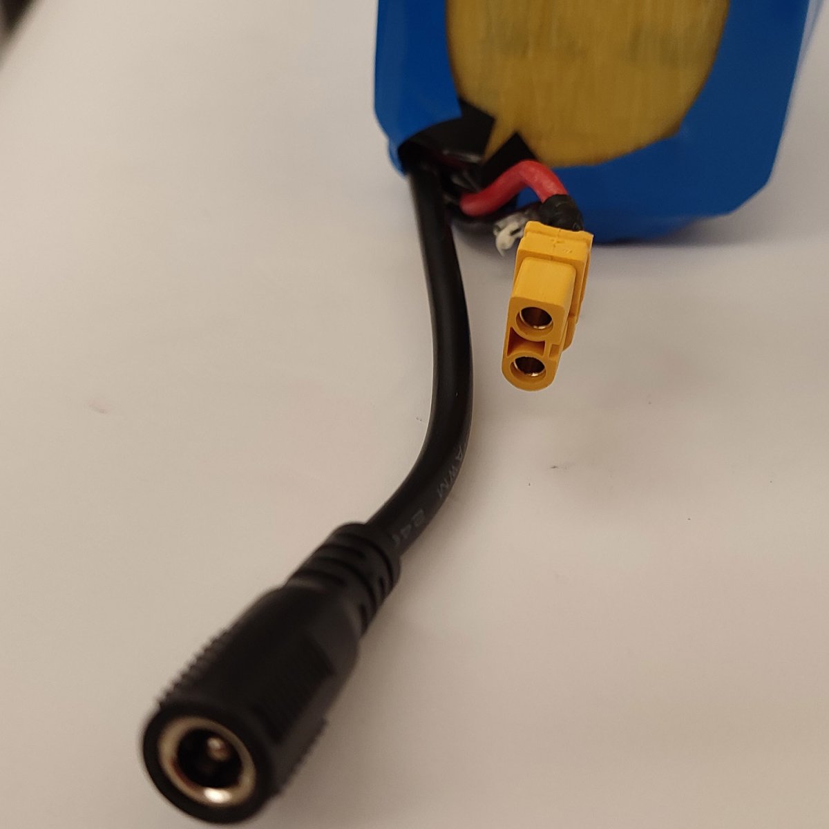 Kommer med XT60 för urladdning och DC för laddning.