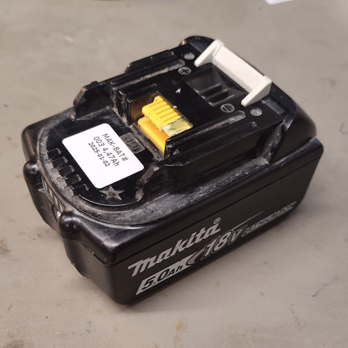 Beg. testat Makita 18V (BL1850B) från 2022 med 4,47/5Ah kvar (ca 89%) eller 78/90 Wh. Nypris ca 1000 kr. Testad i laddare ej i maskin. den gula kontakten är ”fixad”.