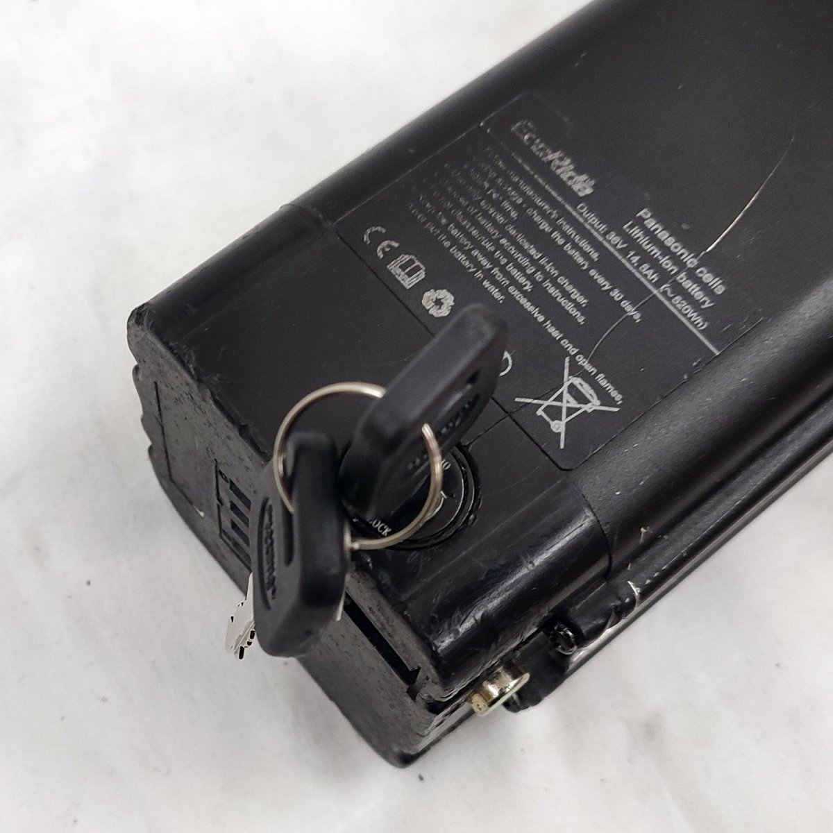 Begagnat testat Ecoride batteri med 12,57/14,5ah = 87% kapacitet kvar (450/520Wh). Laddar och laddar ur som det ska. Nypris 5000 kr. Vi har bytt låset på denna.