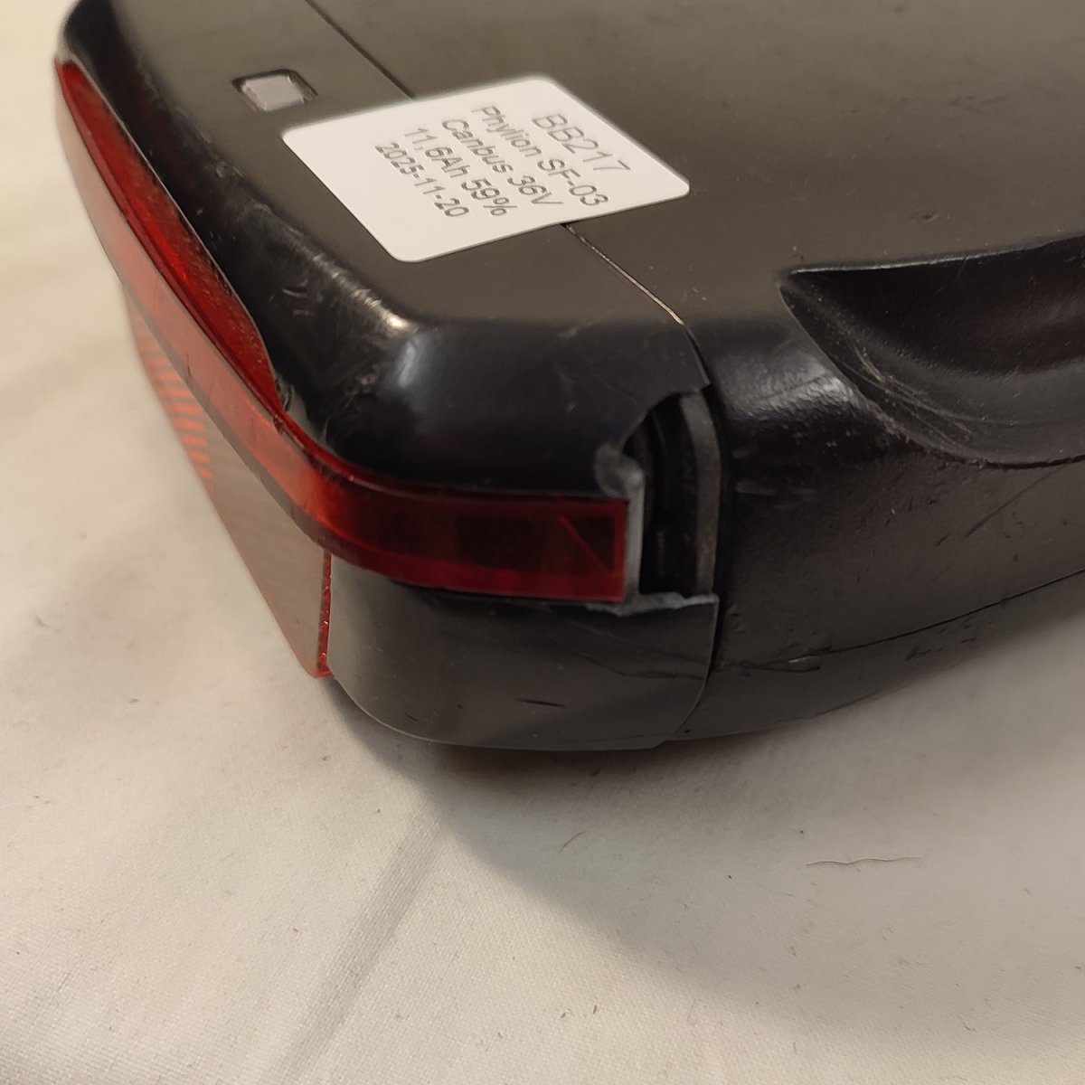 Begagnat renoverat EJ testat batteri. Enligt diagnos rapport 59% SOH/hälsa vilket vi antar är kapacitet? Använd 103 cykler. Vi har laddat det fullt men ej kunnat testa kapaciteten. Baklampa medföljer men är ej testat, har en del defekter kan såklart bytas.