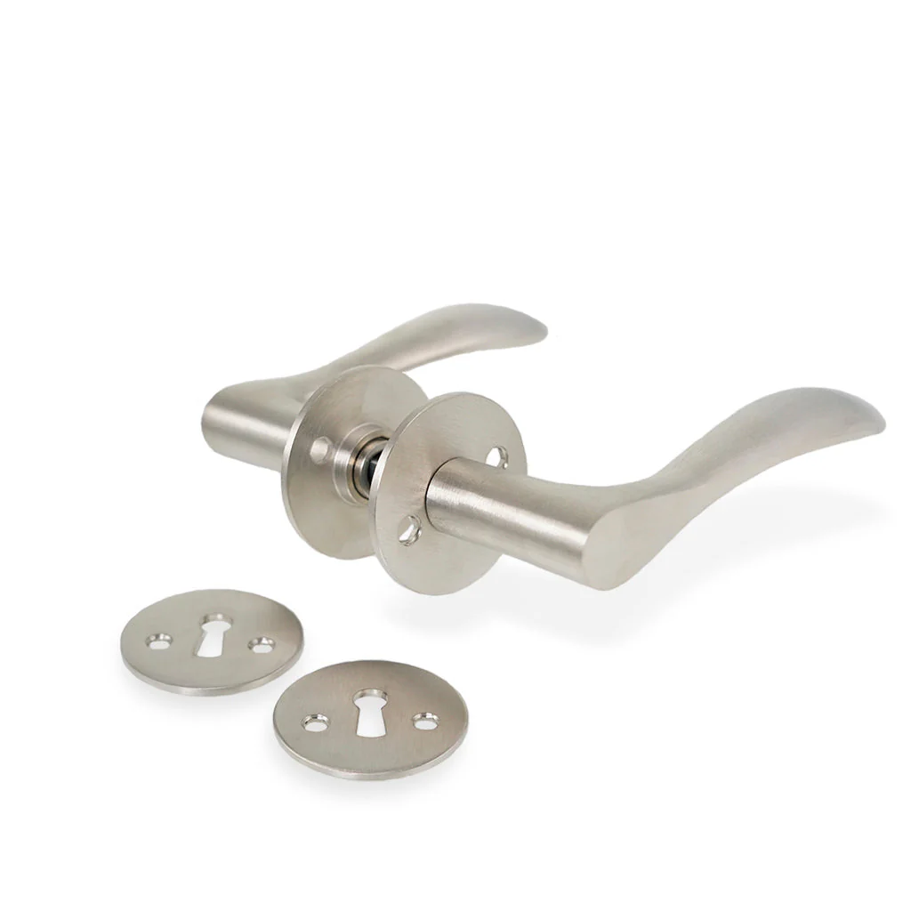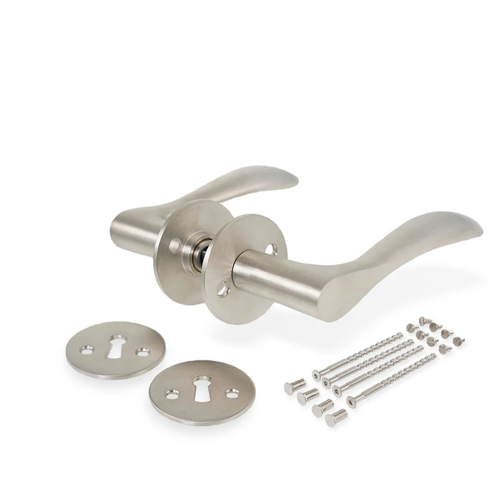Det här vackra Bellevue-dörrhandtaget passar bra in i de flesta interiörer där du vill ha en modern look med kvalitetsmaterial. Dörrhandtaget är slitstarkt och kan användas både inomhus och utomhus. Kan monteras på nya och gamla dörrar med medföljande skruvar. En komplett dörrhandtag inklusive rosetter och nyckelplattor samt infärgade skruvar.