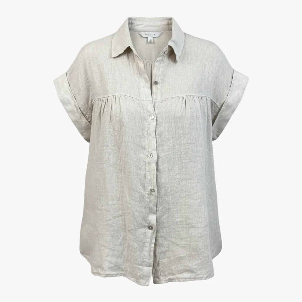 En stilren och sval blus i 100 % linne, perfekt för varma dagar och avslappnade tillfällen. Blusen har korta ärmar med en lätt uppvikt kant för en ledig men genomtänkt look. Den är rak i modeller med en något boxig passform som ger både rörelsefrihet och en modern siluett.