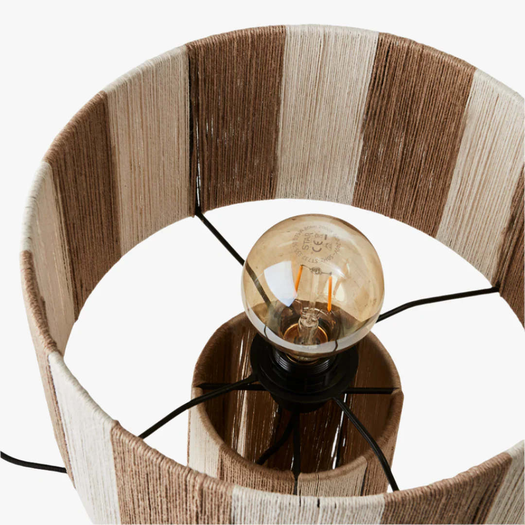 Bordslampan Jullan har en unik design och ett naturinspirerat uttryck som ger hemmet en varm och stilfull känsla. Den eleganta kombinationen av natur- och beigetoner tillsammans med det randiga mönstret skapar en distinkt och iögonfallande look som passar perfekt i ett modernt hem.