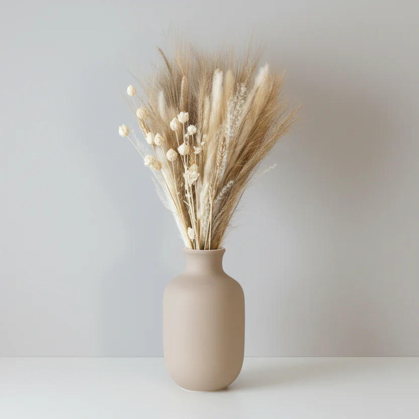 Denna bukett är noggrant sammansatt av olika sorters torkade blommor och växter, där varje stjälk har sin egen unika form, färg och struktur.