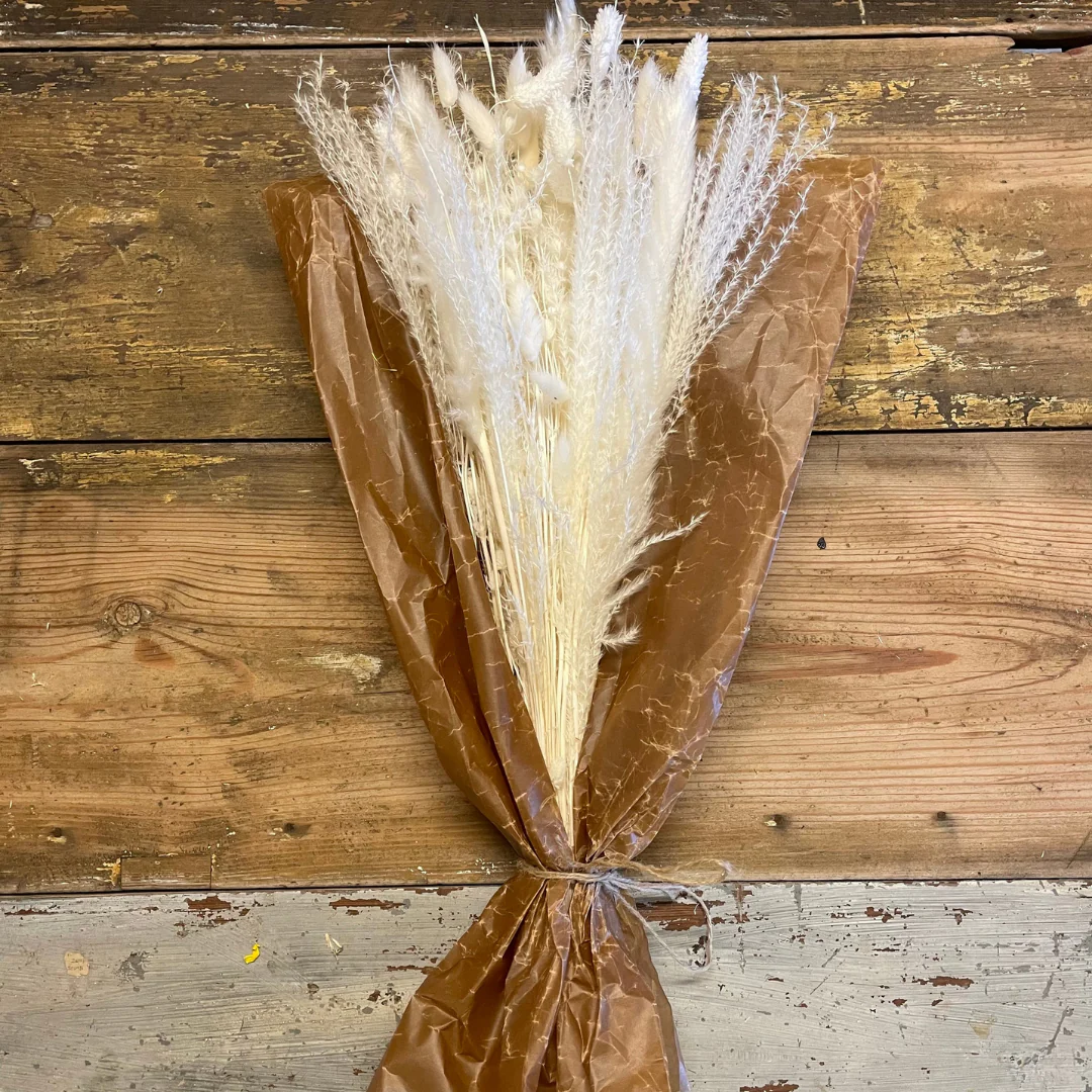 Vita Lugnet är en elegant bukett med torkade blommor i ljusa, vita nyanser som skapar en stillsam och harmonisk känsla i hemmet. Den mjuka mixen av blommor ger en vacker och tidlös detalj som passar perfekt på bord, hylla eller fönsterbräda.