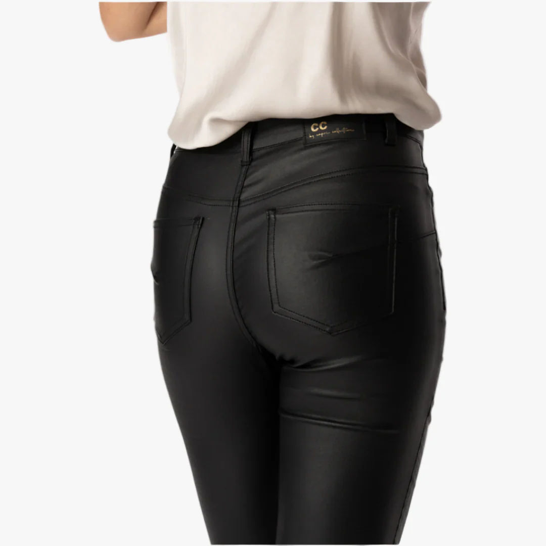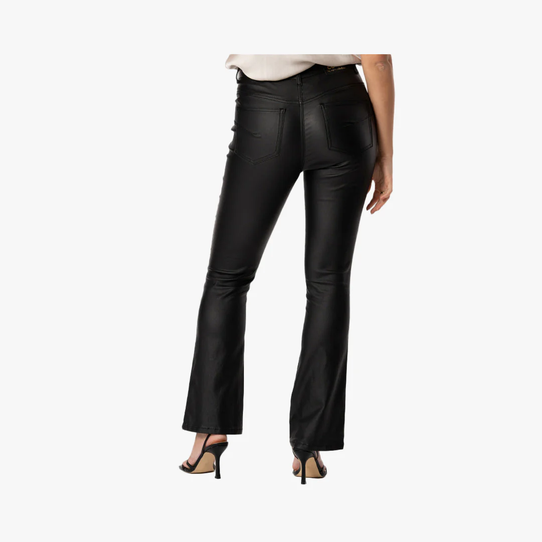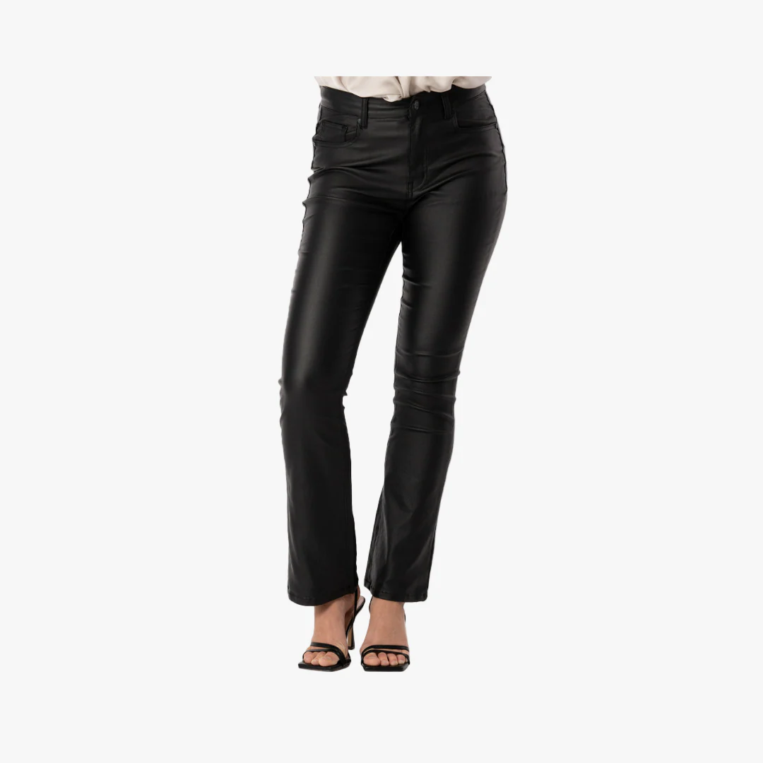 Sassy Coated Pants har en klassisk 5-ficksmodell, fullängd och har en bootcut-passform.