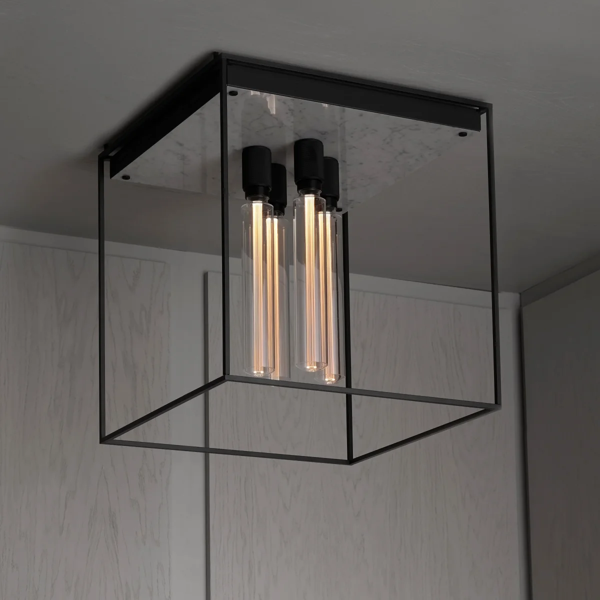 Denna tuffa taklampa från Buster + Punch med svart metallbur ger rummet ett tufft och samtidigt exklusivt uttryck. Lampan finns med bakpanel i vit eller svart marmor.