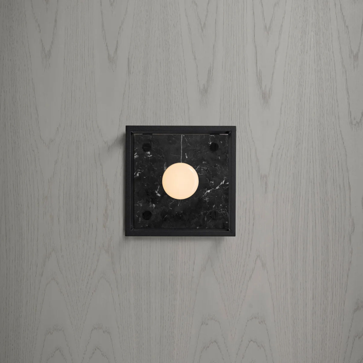 Lampan är tillverkad av svart metall med en bakplatta i polerad svart marmor.