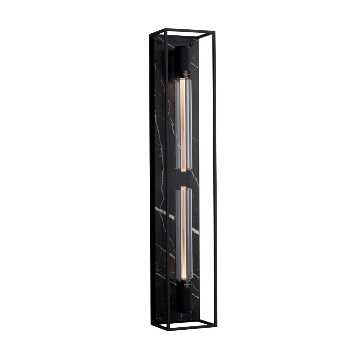 Lampan är tillverkad av svart metall med en bakplatta i polerad svart marmor.