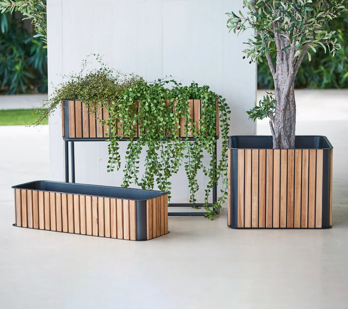 Combine är en modern blomlåda med spännande design och materialmix. Dess varma teak och funktionellt pulverlackerat aluminium ger en unik look som passar in på de flesta platser. Plantera dina favoritkryddor, -blommor eller -träd och tillför lite grönt till din uteplats. Cane-line teak är godkänd och odlas enligt SVLK certifieringssystemet. Det pulverlackerade aluminiumet ger en tålig yta mot stötar och repor.