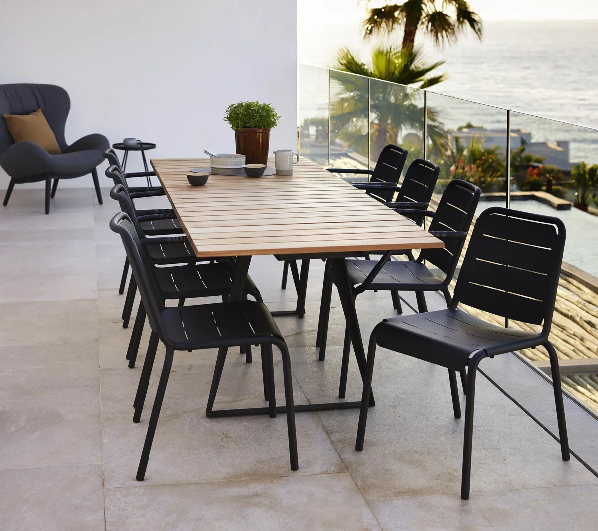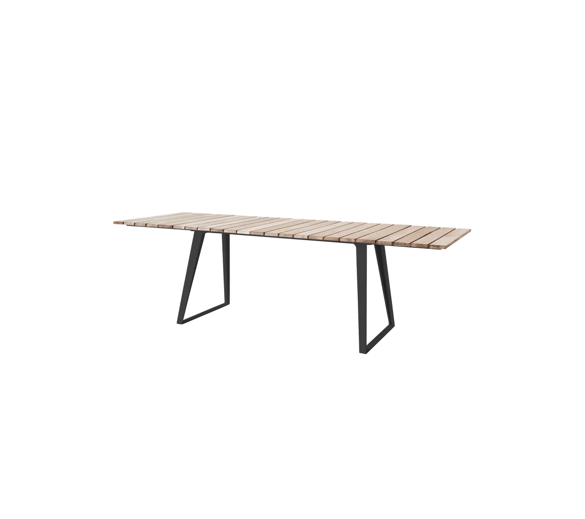 Tanken bakom det färgade, lätta aluminiumet är att möblerna kommer att bli en avslappnad frisk luft i det ofta neutrala möbleruniversumet, både med färger och ett modernt, ljust utseende. Möblerna tar upp mindre utrymme än traditionella trädgårdsmöbler. Det eleganta matbordet, som nu är tillgängligt med teakbord med fasade kanter, vars raffinerade linjer återkommer i ramen. Med två blad mäter bordet upp till 243 cm – men med en mycket smal bredd på 84 cm kan den fortfarande passa in på många ställen. Cane-line teak är godkänd och odlas enligt SVLK certifieringssystemet.