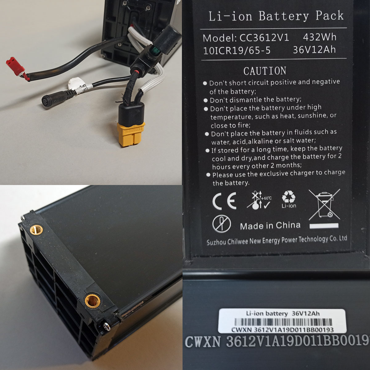 Testat batteripack från CPET (Suzhou Chilwee Energy Power Technology) byggt för 250W elscooters. Vi har fått in en hel del av dessa som vi håller på att testa. Alla är identiska med 10S5P (36V12Ah) med celler från BAK (eller GPHN). De flesta är använda men bara ett fåtal cykler (ca 20-100 stycken som mest), det kan finnas lite damm på skalen etc.