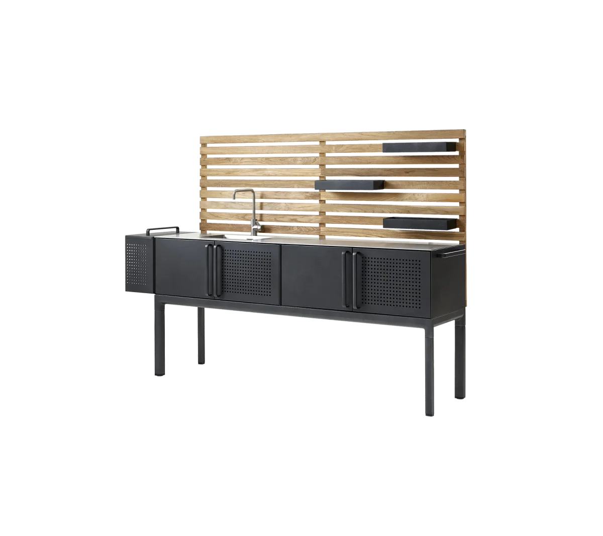 Drop består av en komplett köksmodul med inbyggd diskho, fyra rymliga köksskåp med teakribbor i botten samt en avtagbar och flyttbar avfallsbehållare och tre dekorativa och funktionella hyllor som kan placeras såsom önskas. Kökets bakre vägg består av ribbor i certifierad teak, som matchar skåpbotten och ger en varm och nordisk look.