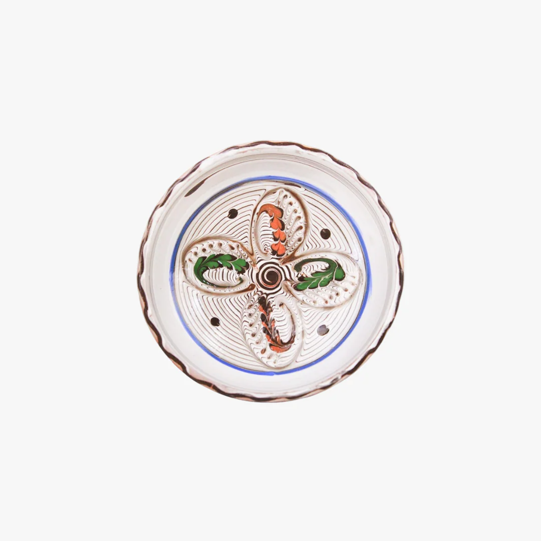 Vackert fat i handdrejat lergods med handmålade, dekorativa och färgglada mönster enligt gammal teknik. Glaserade både på insidan och utsidan.