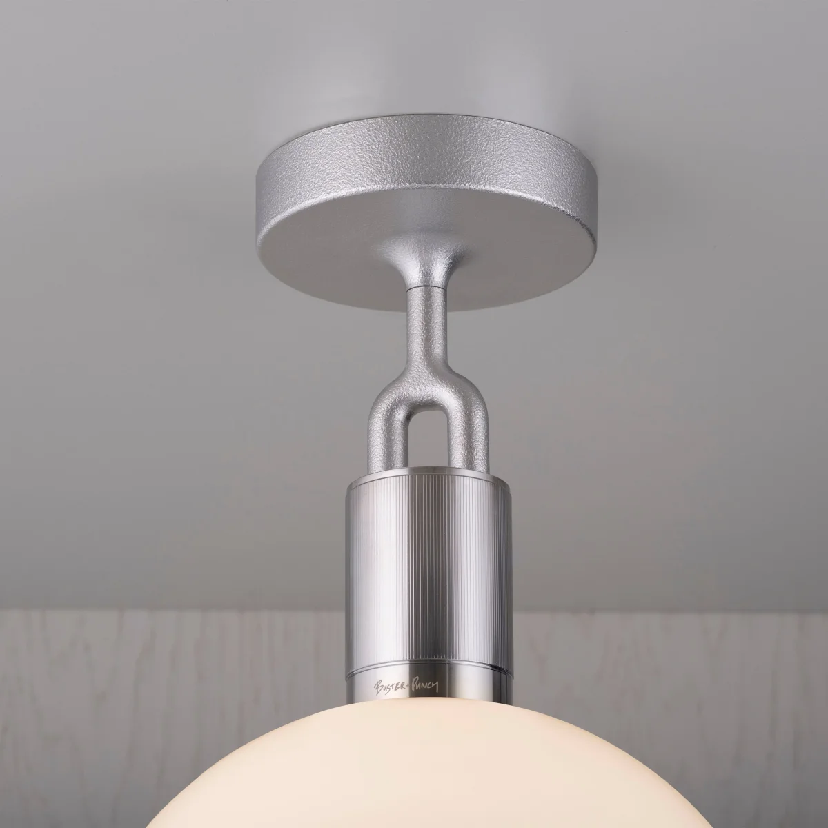 Med Buster + Punchs Forked taklampa får du en elegant lampa som på finaste vis kombinerar en rå stålfattning med en elegant skärm i munblåst opalglas. Fattningen är dekorerad med Buster + Punchs karaktäristiska linjerade mönster.