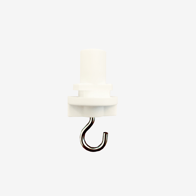 Krokfäste med krok som kan fästas i en monterad trefas skena. Används för att hänga saker i skenan och slippa montera krokar i taket.