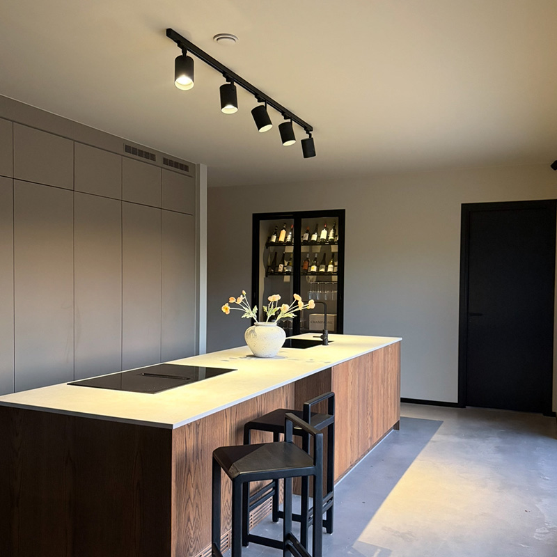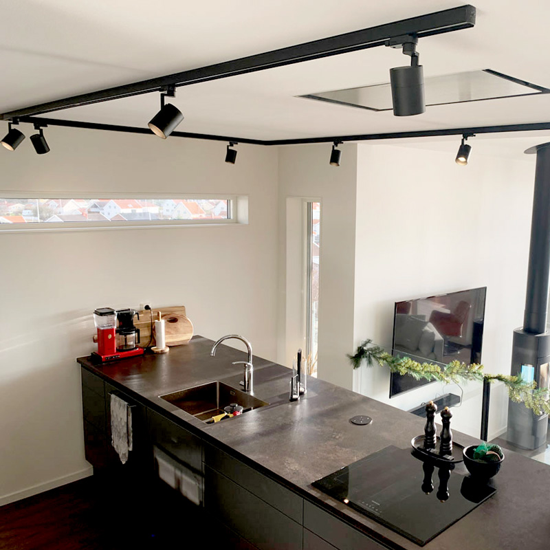 Modell Global Trac Pro. Global Trac Pro är 3-fas skenor vilket innebär att man kan koppla in 3 olika styrningar till dem om man vill. Men oftast kopplar man bara in en ledning. Dvs skenorna fungerar i vanliga elsystem i privata hem.