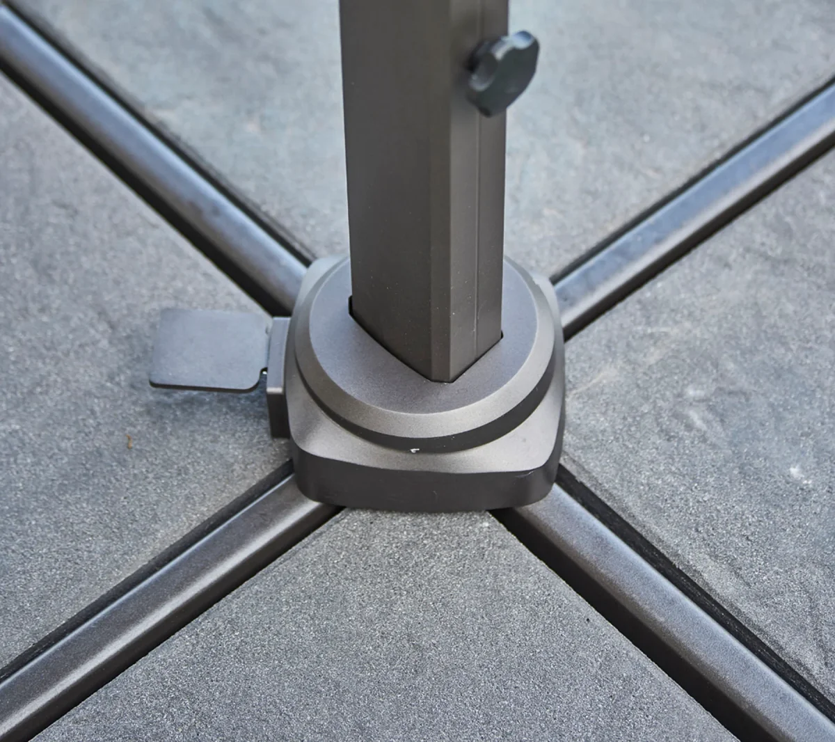 4 plattor som passar till Hyde Luxe-parasollet. Den starka basen består av fyra stora plattor som placeras i det medföljande metallkorset för parasollet, vilket gör det motståndskraftigt mot vind och väder. Den fyrkantiga parasollbasen skapar en solid och stark grund för ditt Hyde Luxe-parasoll. Betongplattorna har ett naturligt och tidlöst utseende som passar in i de flesta utomhusmiljöer.