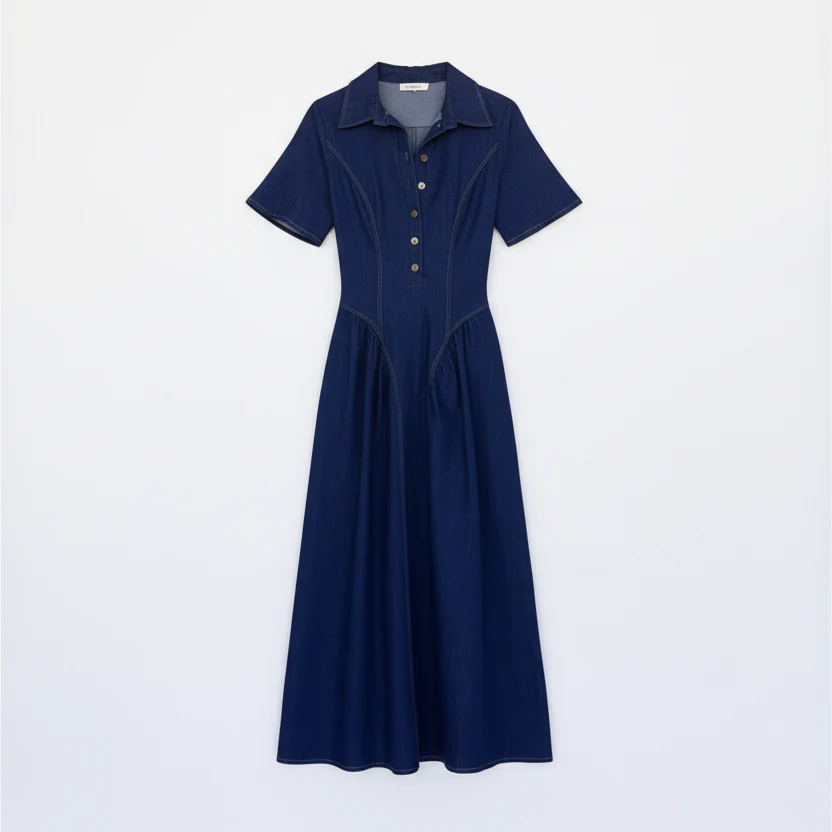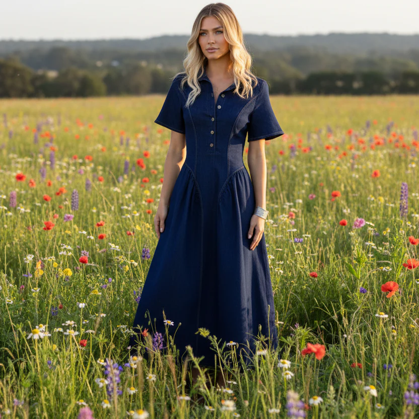 Elva jeansklänning i mörk jeansblå nyans kombinerar en tidlös stil med modern design. De dekorativa knapparna framtill ger klänningen en klassisk och stilren look, samtidigt som den mörka färgen gör den enkel att matcha och bära vid många olika tillfällen.