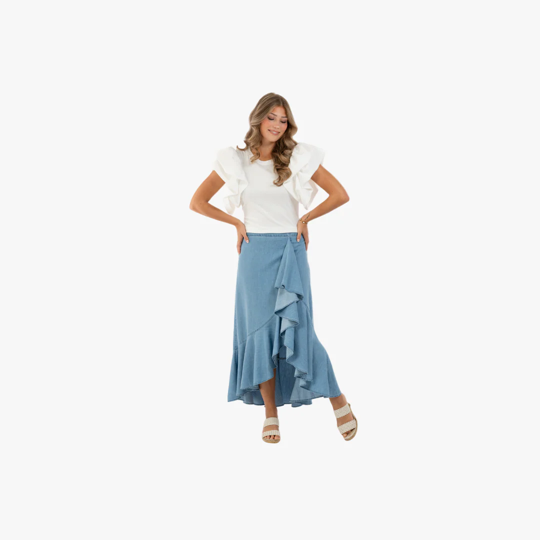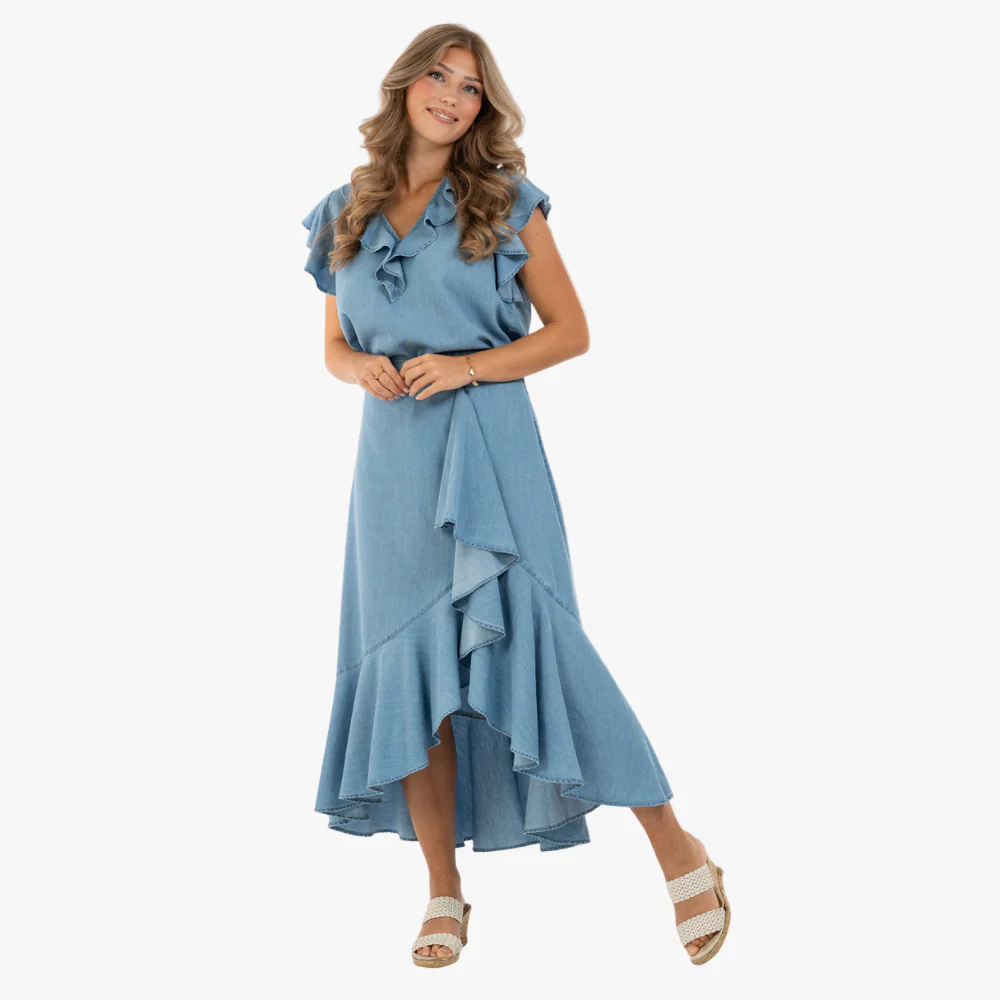 Trendig volangkjol i mjuk bomulls chambray, en mjuk denimliknande kvalité. Hellång baktill och kortare framtill med en bred volangkant som startar i midjan och sedan följer hela kanten från framsidan och runt bak. Smickrande passform med dold dragkedja bak.