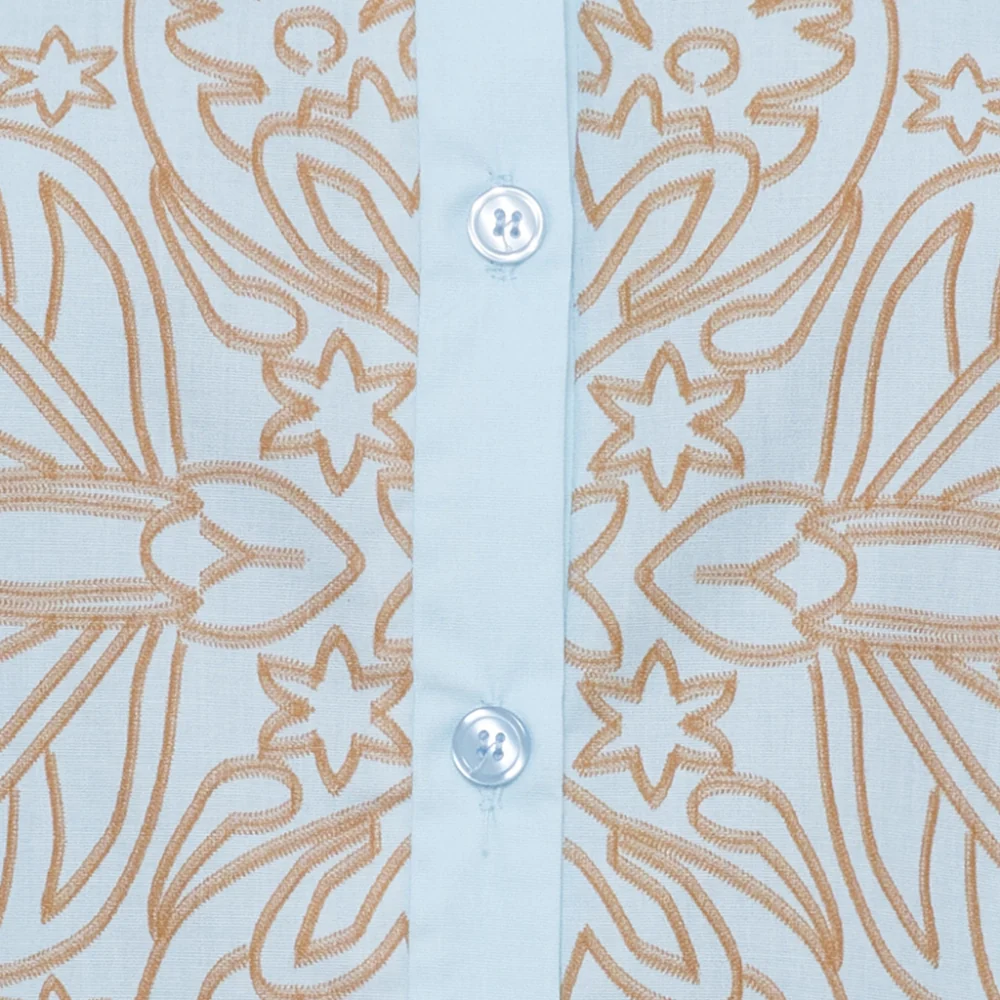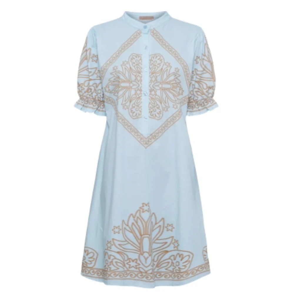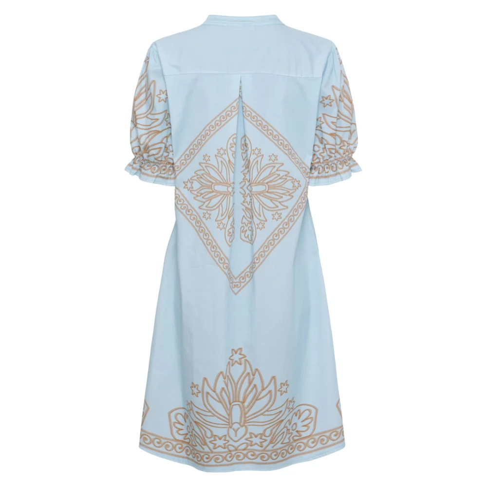 Klänning Athena i blått är en elegant och feminin klänning med vackra broderade mönster som ger ett exklusivt och detaljrikt uttryck.