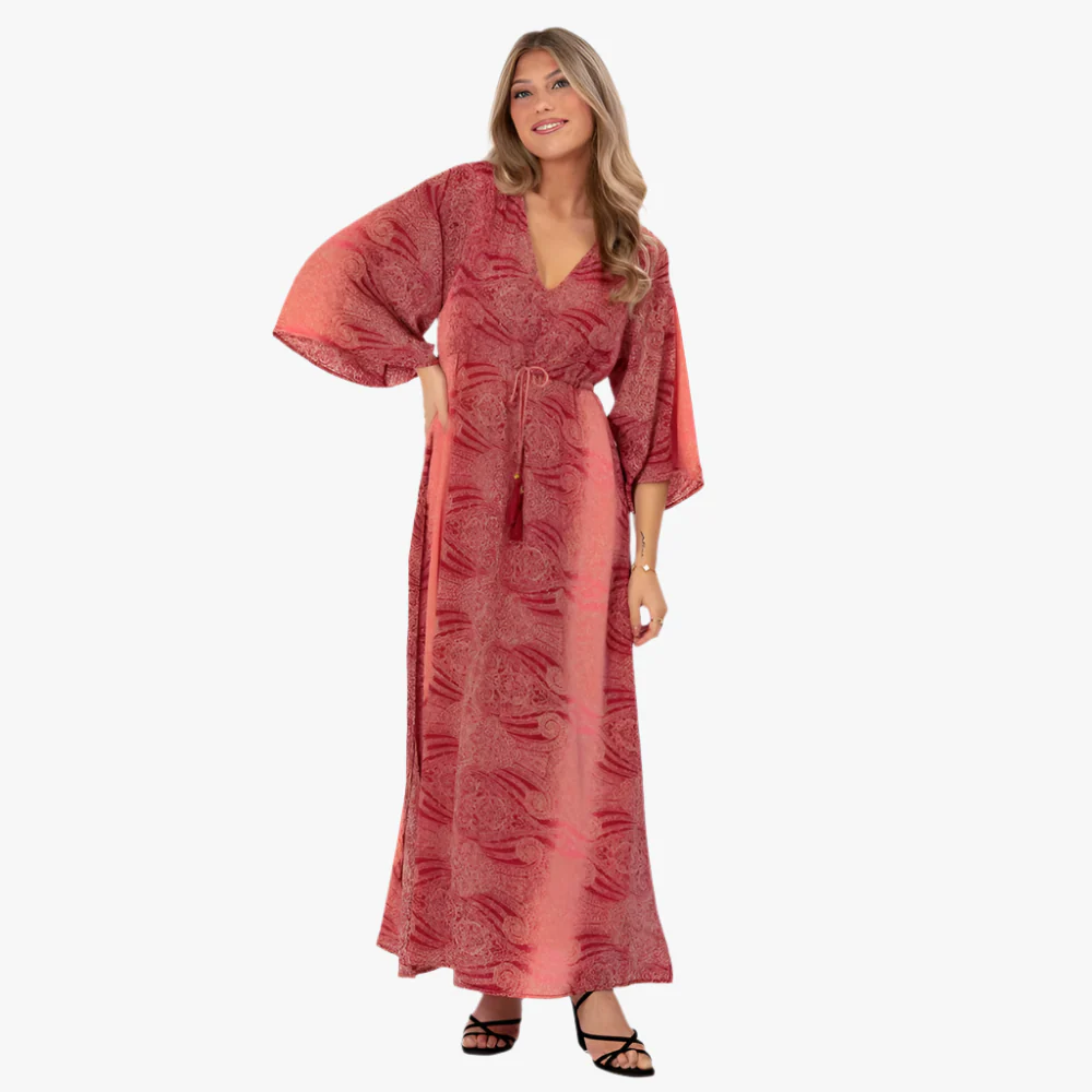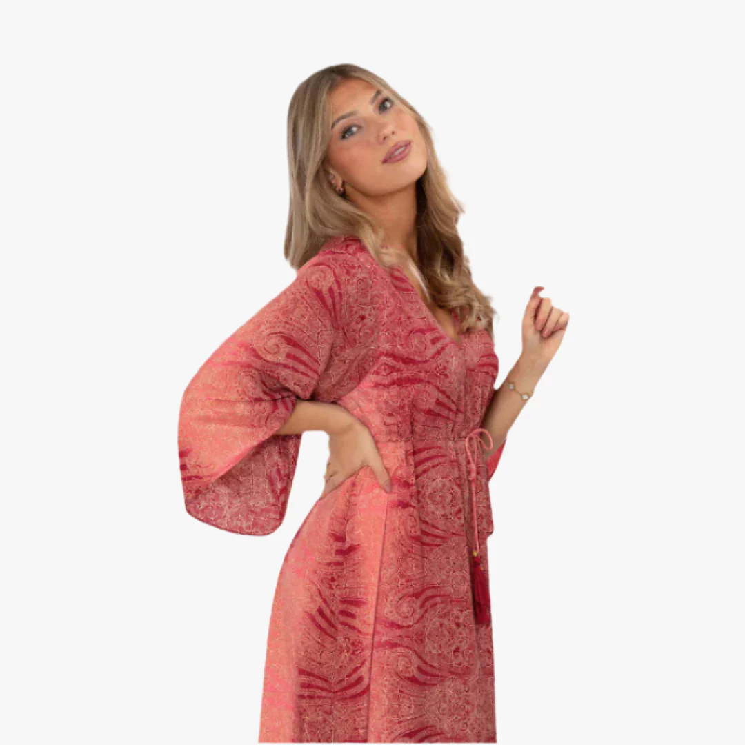 Klänning Aurelia är en färgstark och feminin klänning med ett trendigt paisleymönster i hallon och corall. De livfulla färgerna ger ett energifyllt och somrigt uttryck som verkligen sticker ut.