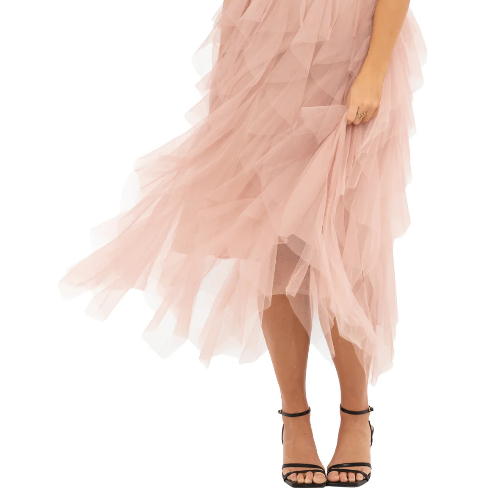 Kjoldelen består av flera horisontella lager av tyll som ger en vacker volangeffekt med härlig rörelse och ett luftigt fall.