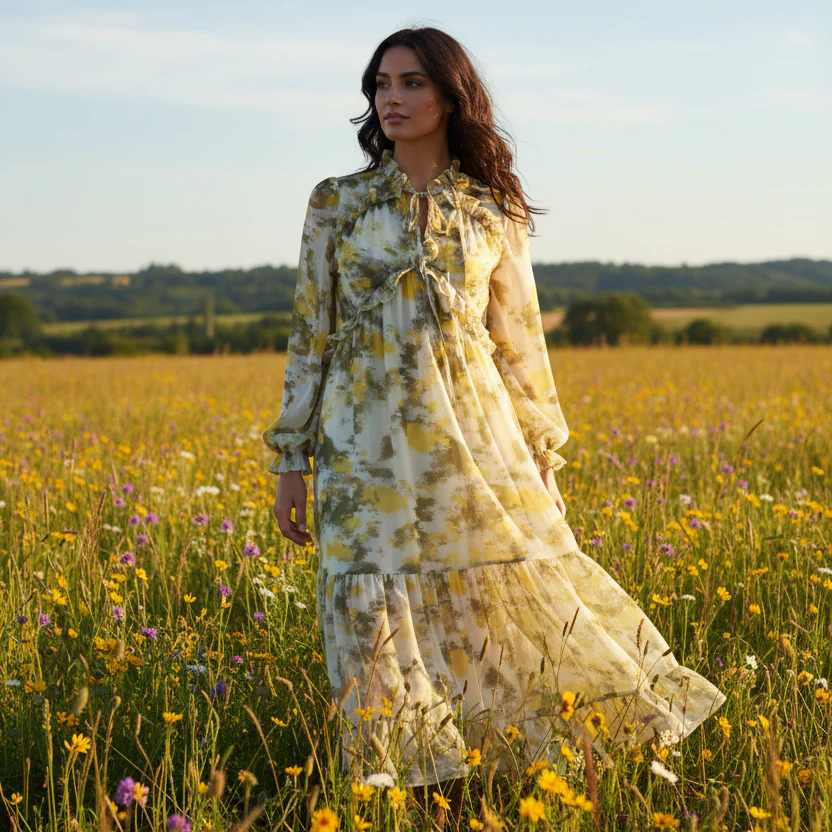 Klänning Elowen är en romantisk och feminin klänning i mjuka färgtoner med ett vackert mönster. De fina volangerna ger klänningen liv och rörelse samtidigt som de förstärker det eleganta och lekfulla uttrycket.