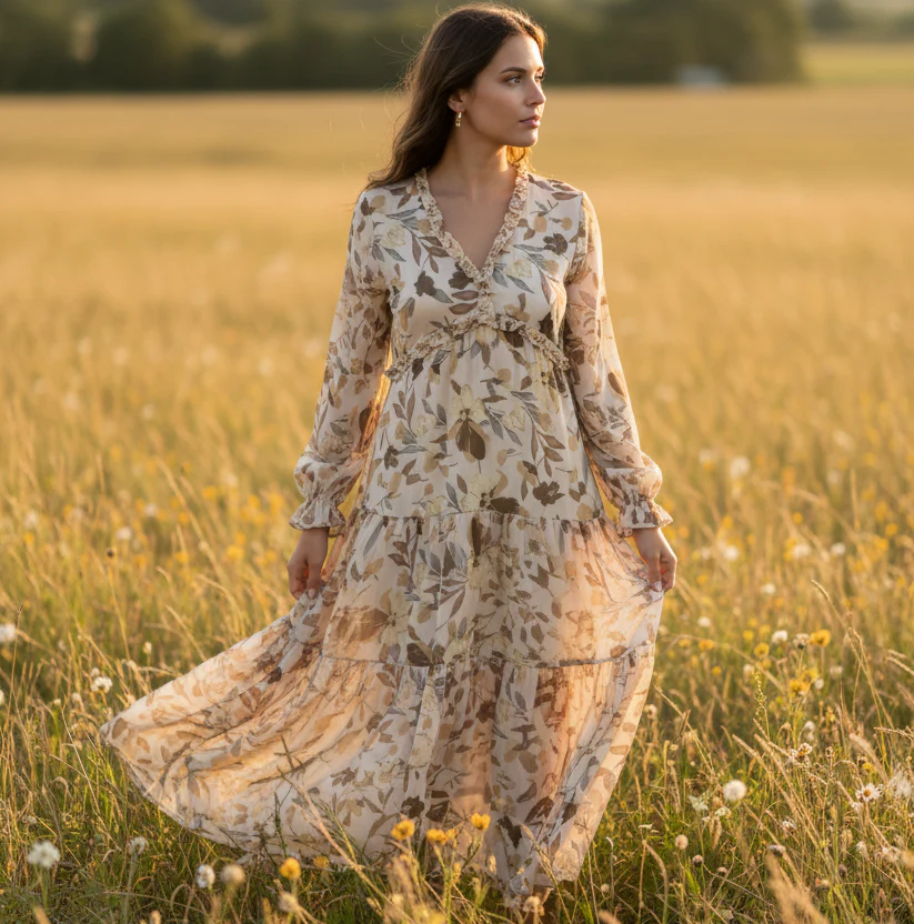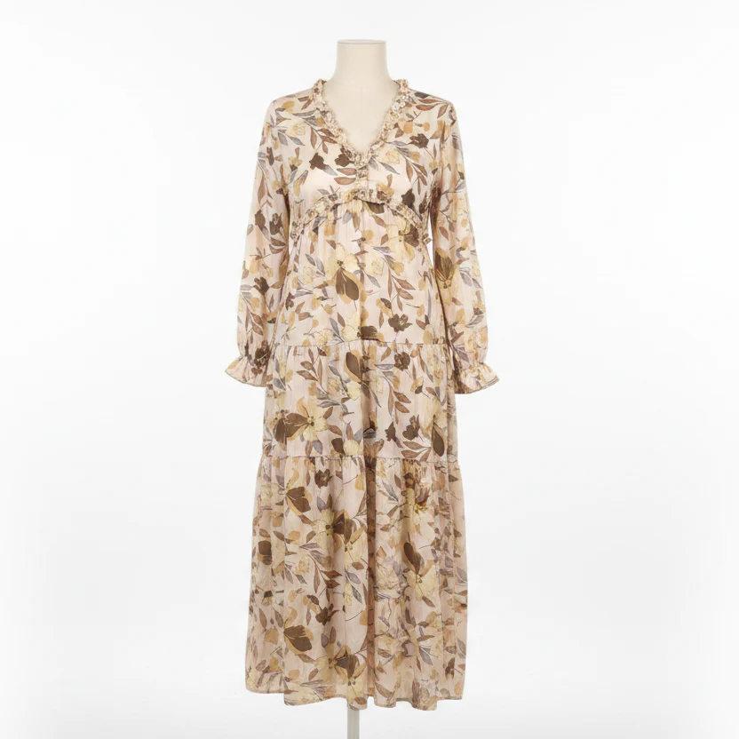 Klänning Rosalie är en romantisk och feminin klänning i mjuka beiga toner med ett vackert blommönster. De fina volangerna ger klänningen liv och rörelse samtidigt som de förstärker det eleganta och lekfulla uttrycket.