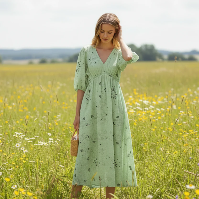 Den mjuka gröna färgen tillsammans med det diskreta mönstret ger klänningen ett fräscht och somrigt uttryck som känns både stilrent och tidlöst.