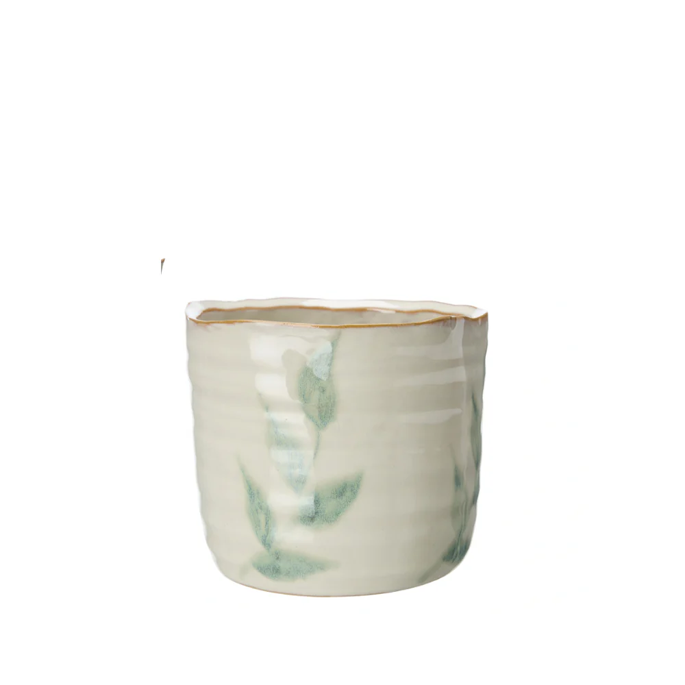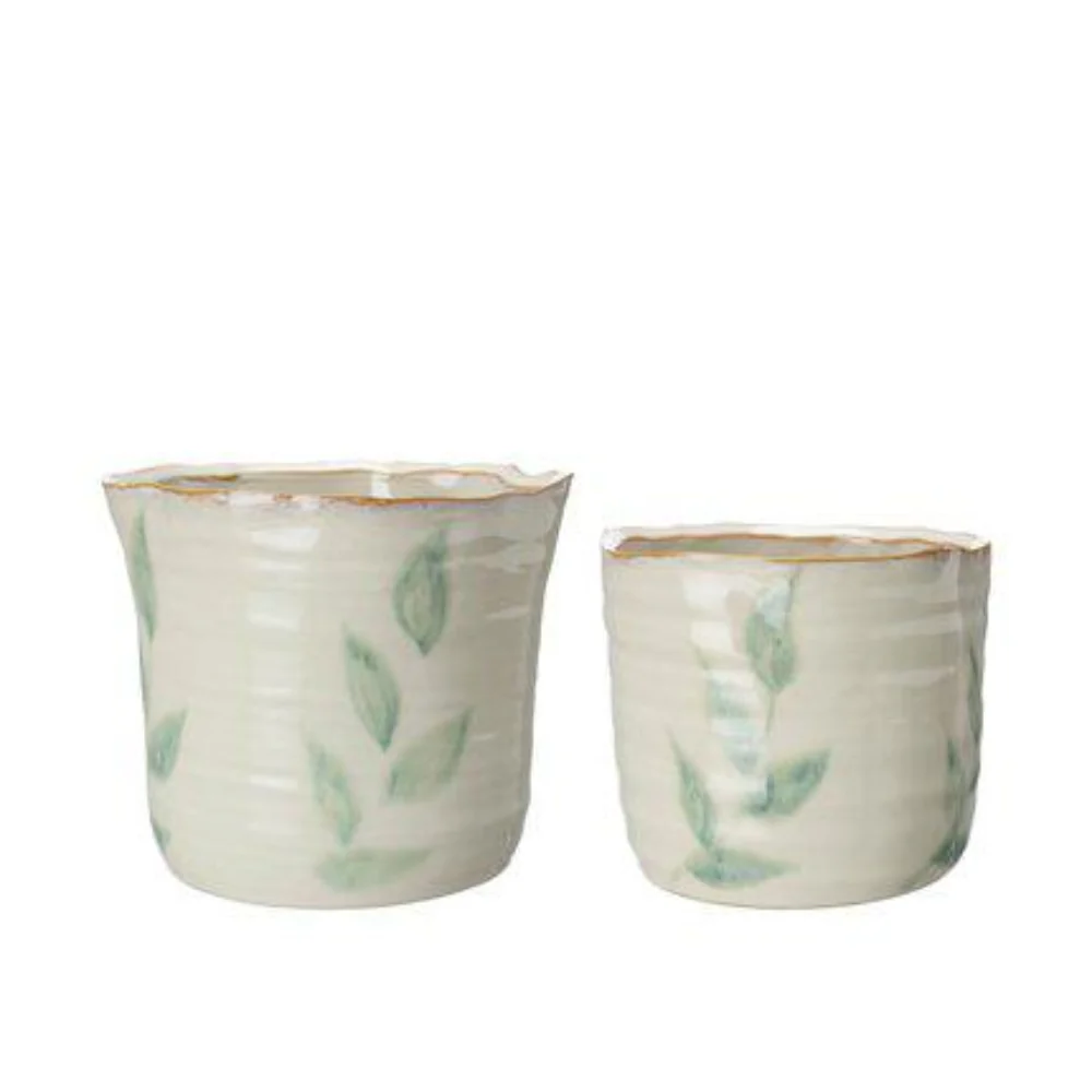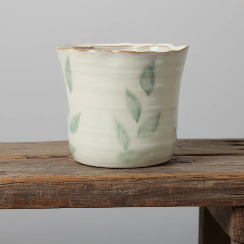 Vacker Kruka Viola i stengods med elfenbensvit bas och dekorativa gröna blad. Den vågiga formen och den handgjorda känslan ger ett levande och personligt uttryck som passar perfekt i både klassisk och modern inredning.