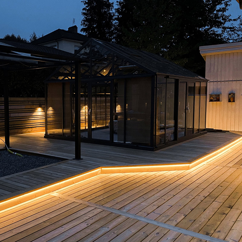 Den produkt passar för långa slingor med ljus utomhus. Till exempel längs murar, fasader eller altaner. Via en inkoppling kan upp till 20m kopplas i en lång slinga. Tänk på att denna ljusslinga är rätt stark utomhus om det är mörkt runt omkring. Placera gärna den i en aluminiumprofil med vit opalplast framför för stabil installation. För att minska ljusstyrkan går det bra att även koppla på dimmer. Tänk på att välja rätt profil som passar bredden för denna LED-strip. Vi rekommenderar aluminiumprofil Elegant.