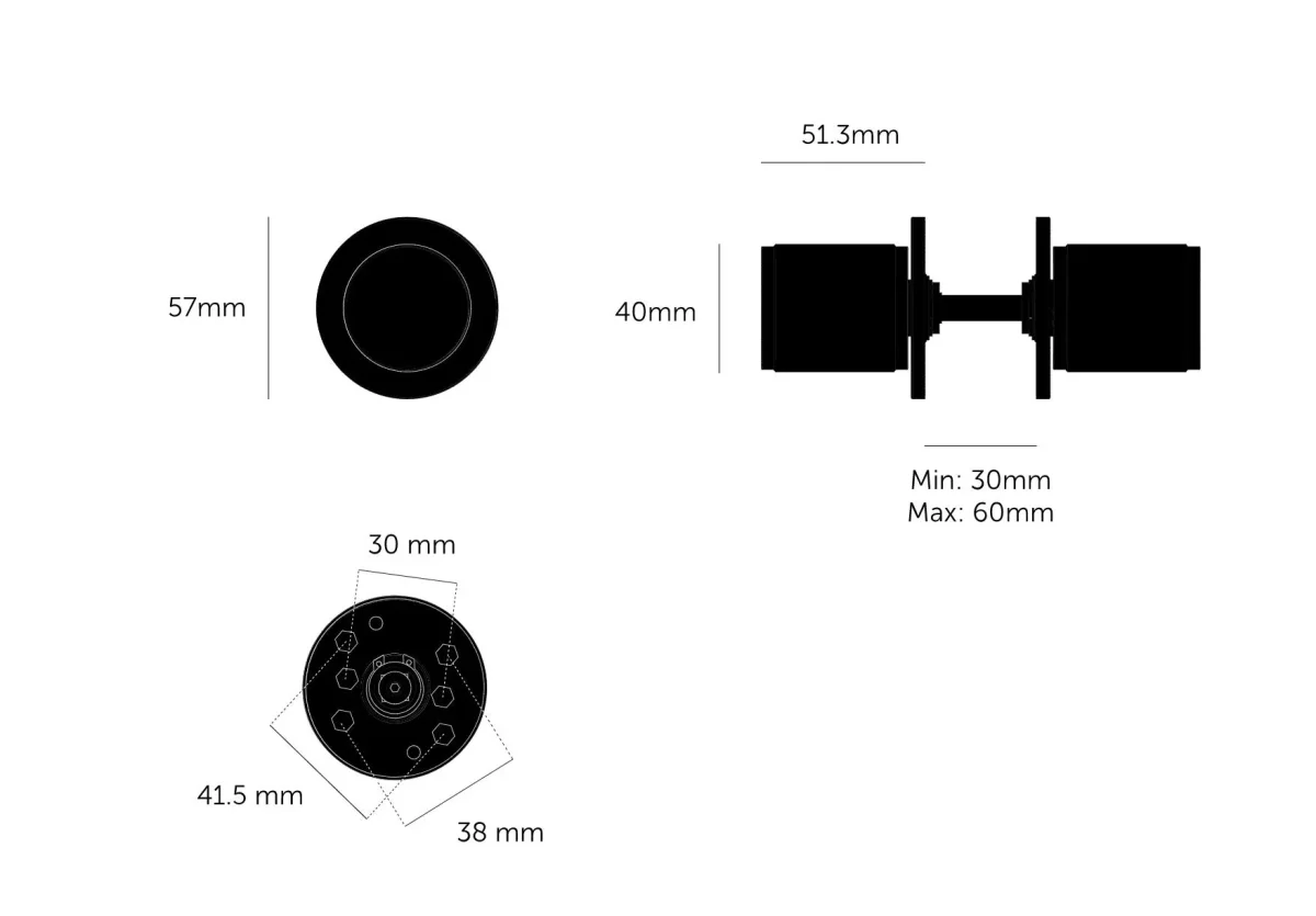 Dörrknoppen kan monteras på dörrar med en minsta tjocklek på 30 mm och en maximal tjocklek på 60 mm.