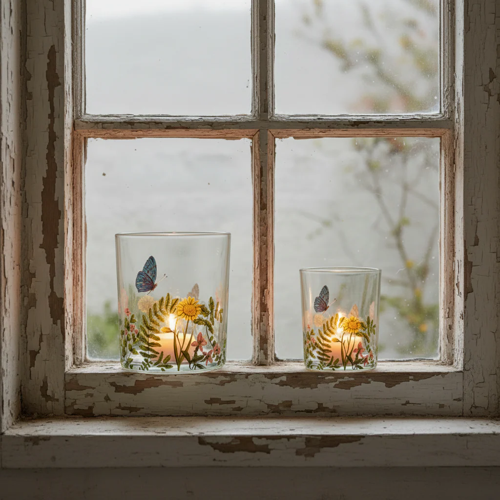 Upptäck Ljuslykta Anna, en vacker och dekorativ ljuslykta med motiv av blommor, blad och fjärilar som skapar en mjuk och romantisk känsla i hemmet. När ljuset tänds sprids ett varmt och stämningsfullt sken genom den fina designen. Lyktan passar perfekt i fönstret, på bordet eller som en del av en dekorativ grupp tillsammans med andra ljuslyktor.