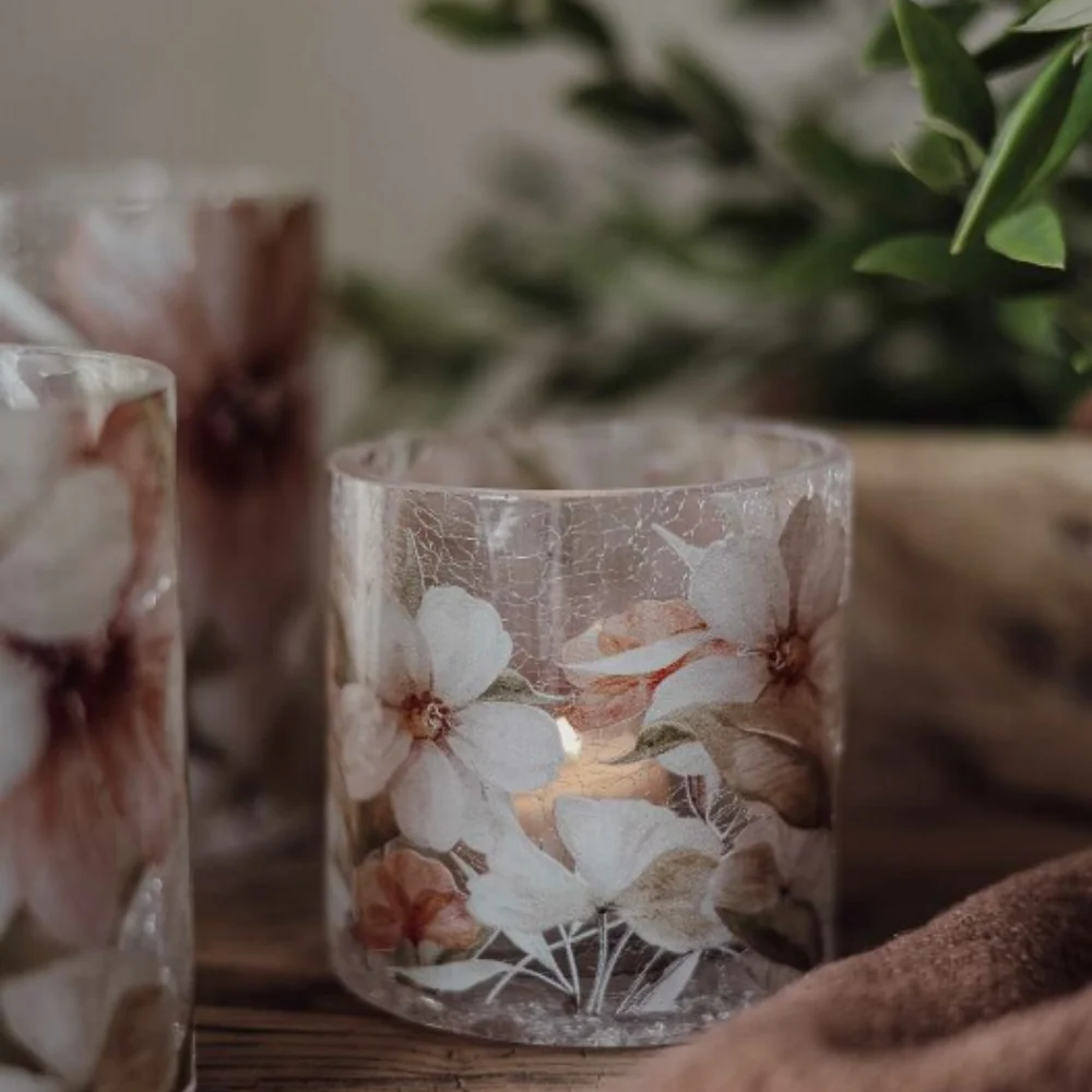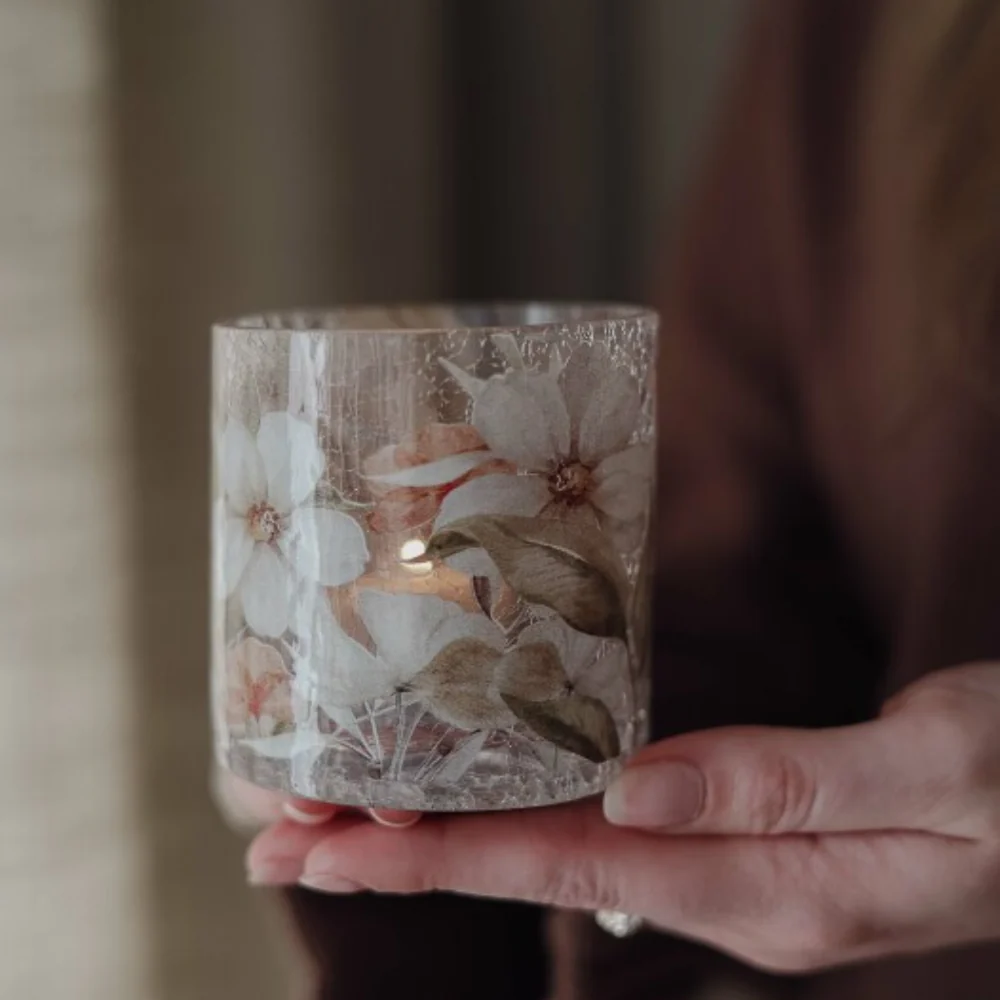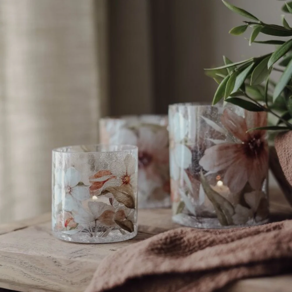 Majas lykta Fleur är en handgjord glaslykta i krackelerat glas med vackra blommor och blad i naturens mjuka toner.