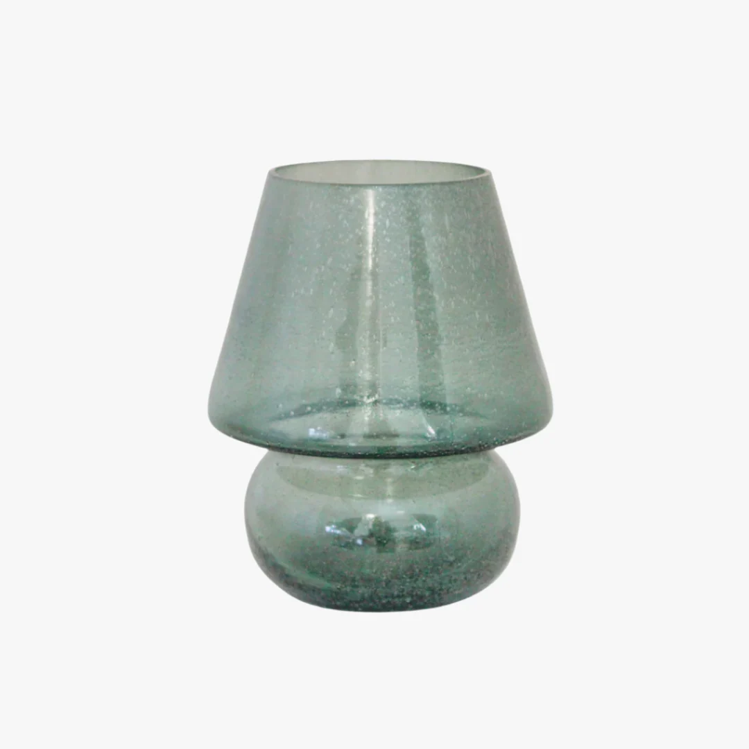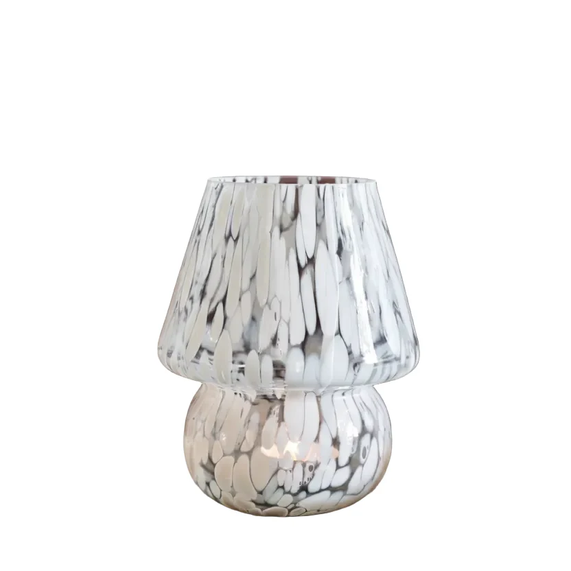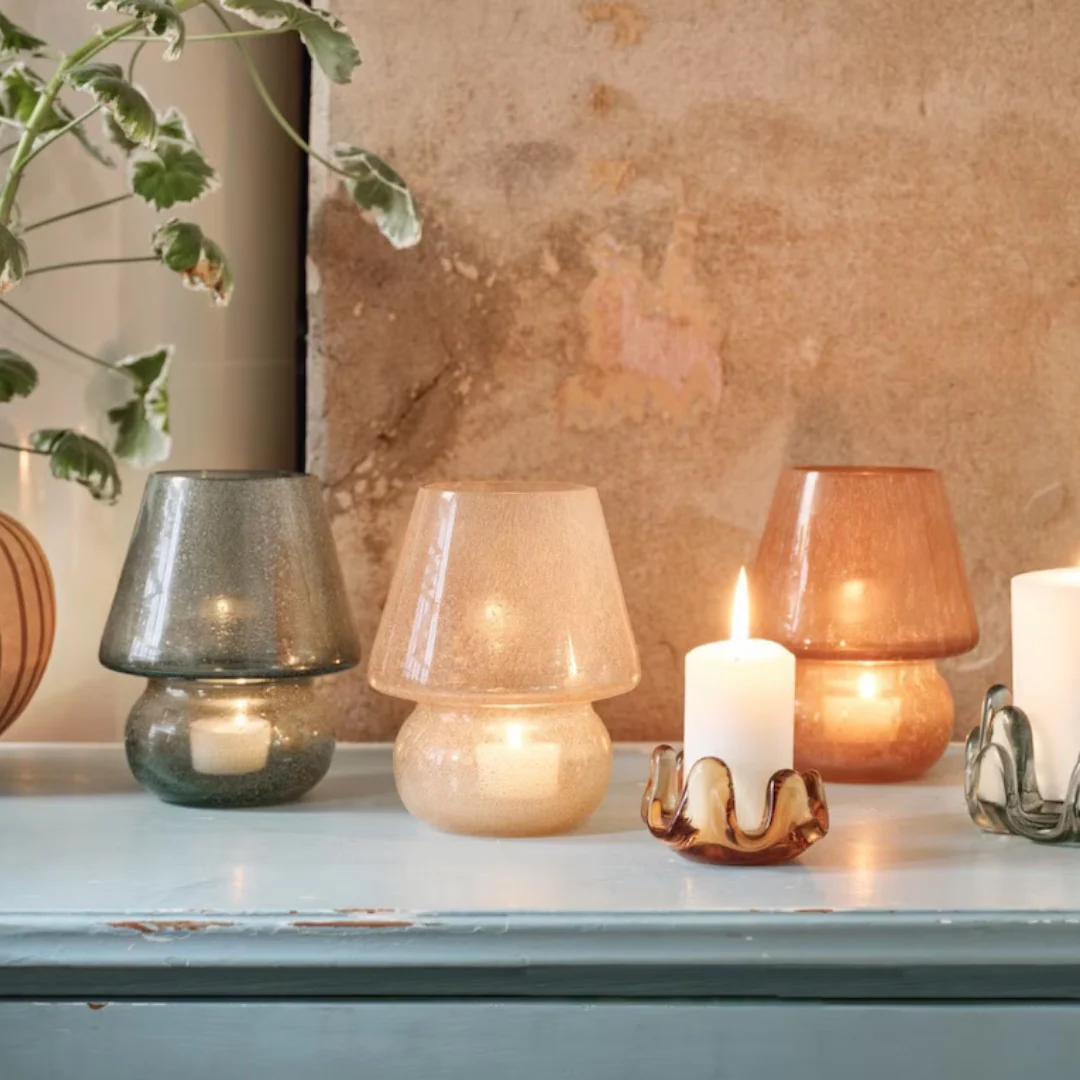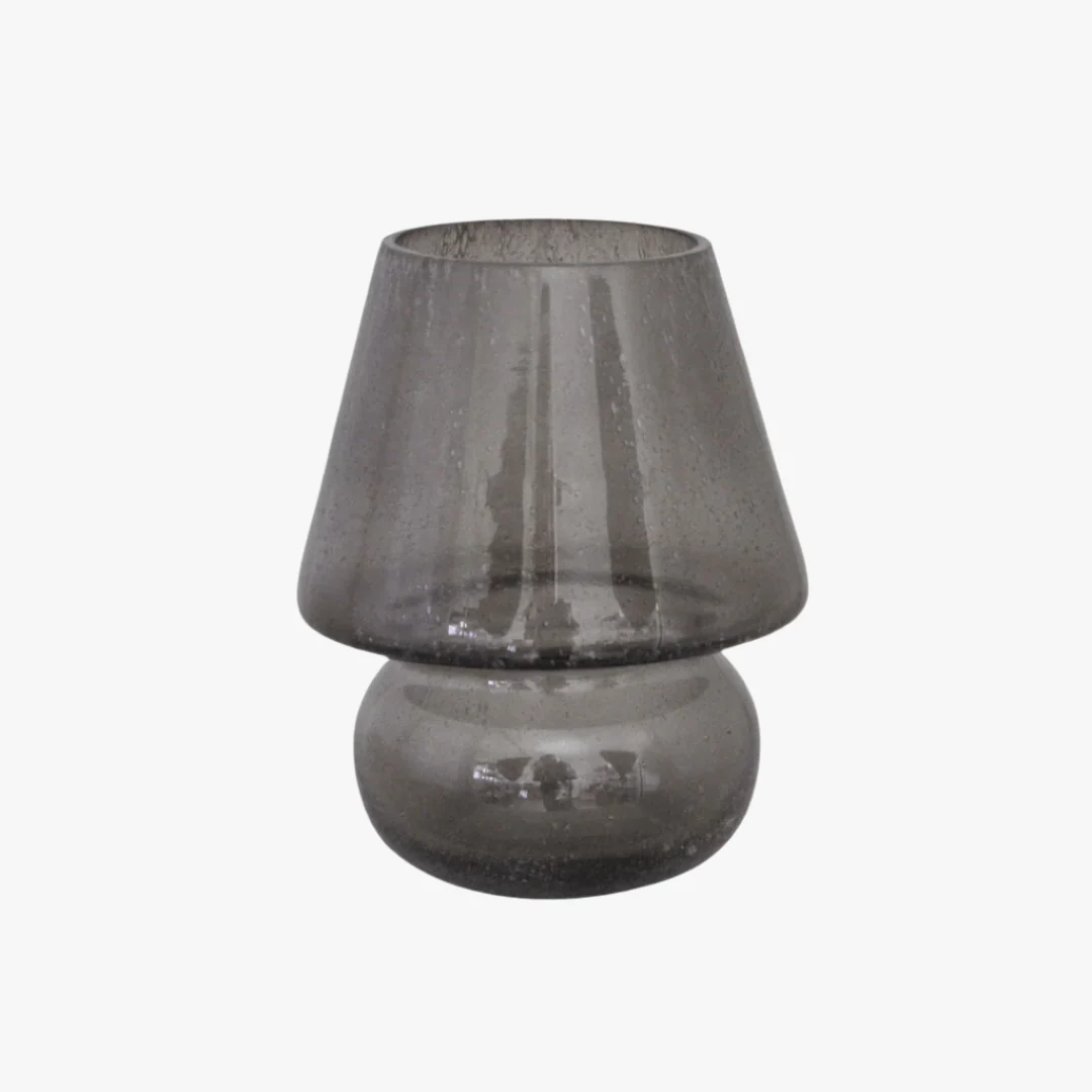 En charmig ljuslykta i glas formad som en svamp. Det handblåsta glasets vackra mönster fångar ljuset och sprider ett mjukt, stämningsfullt sken som skapar en mysig atmosfär i rummet.