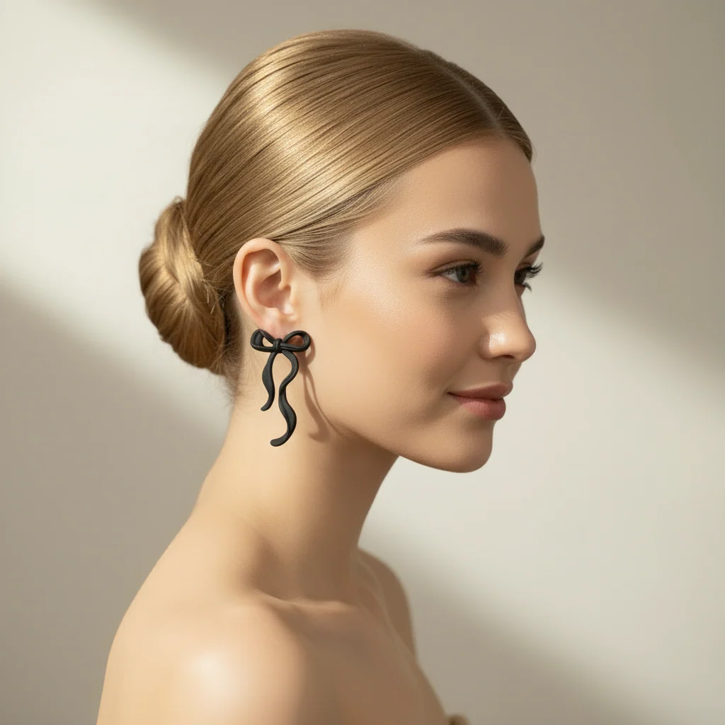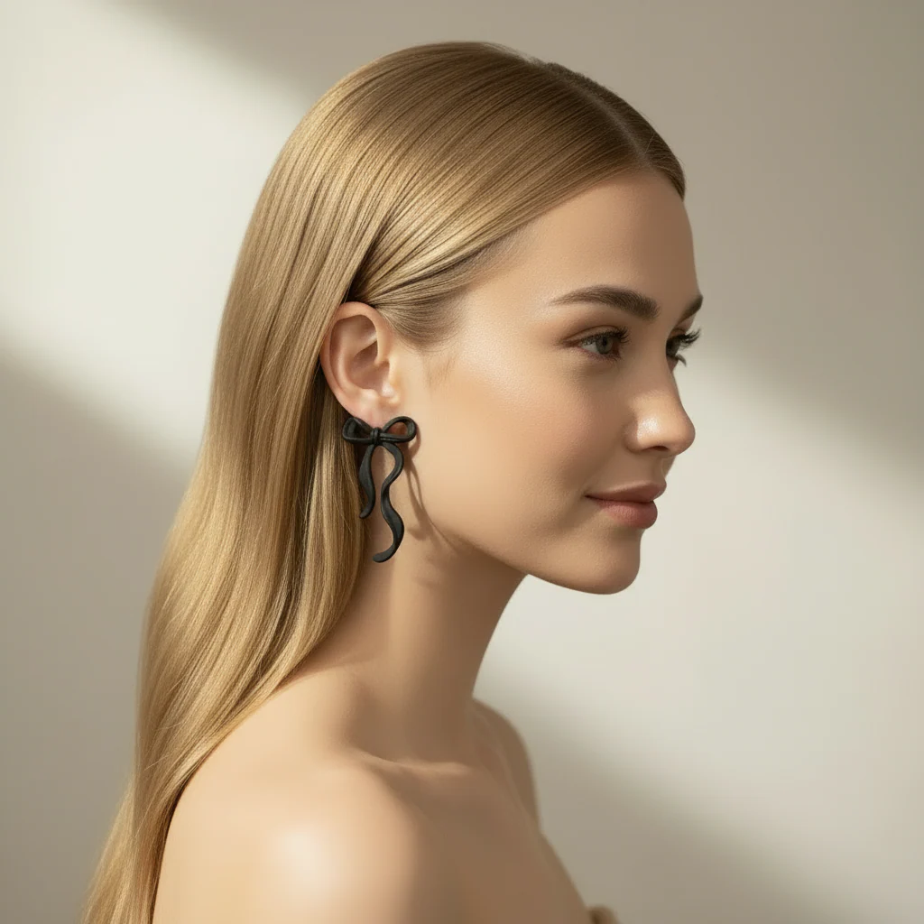 Black Bow är ett par eleganta örhängen i form av en stilren rosett – tillverkad i svart matt metall med exklusiv, modern känsla. Den mjuka formen och den matta ytan gör dem lika vackra till vardags som till fest.