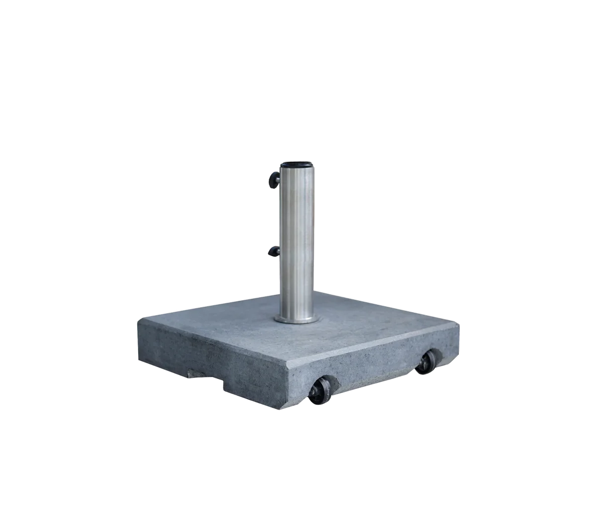 Denna praktiska parasollfot med hjul gör det lättare att flytta ditt parasoll. Den har en modern och tidlös design, vilket gör att den passar perfekt med de flesta uterum. Foten är gjord i granit, vilket blir ett vackert och modernt inslag på din terrass. Den passar alla parasoller med en diameter på 21, 38, 48 och 54 mm. Den väger 50 kg.