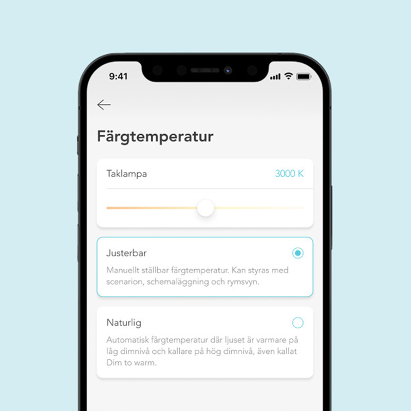 Anpassa enkelt ljuset efter designval och tillfälle. Med justerbar färgtemperatur kan du justera ljusets utseende mellan kallt och varmt för att skapa olika stämningar och stilar. Välj exempelvis varmt ljus för avkoppling och kallt för en mer produktiv miljö.