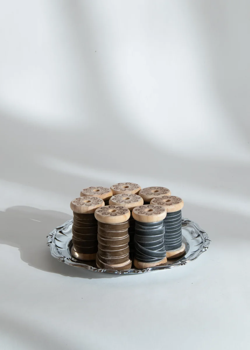 Sammetsband, 5 m på dekorativ träspole. Grå eller hazel (brun). Bredd 1cm.