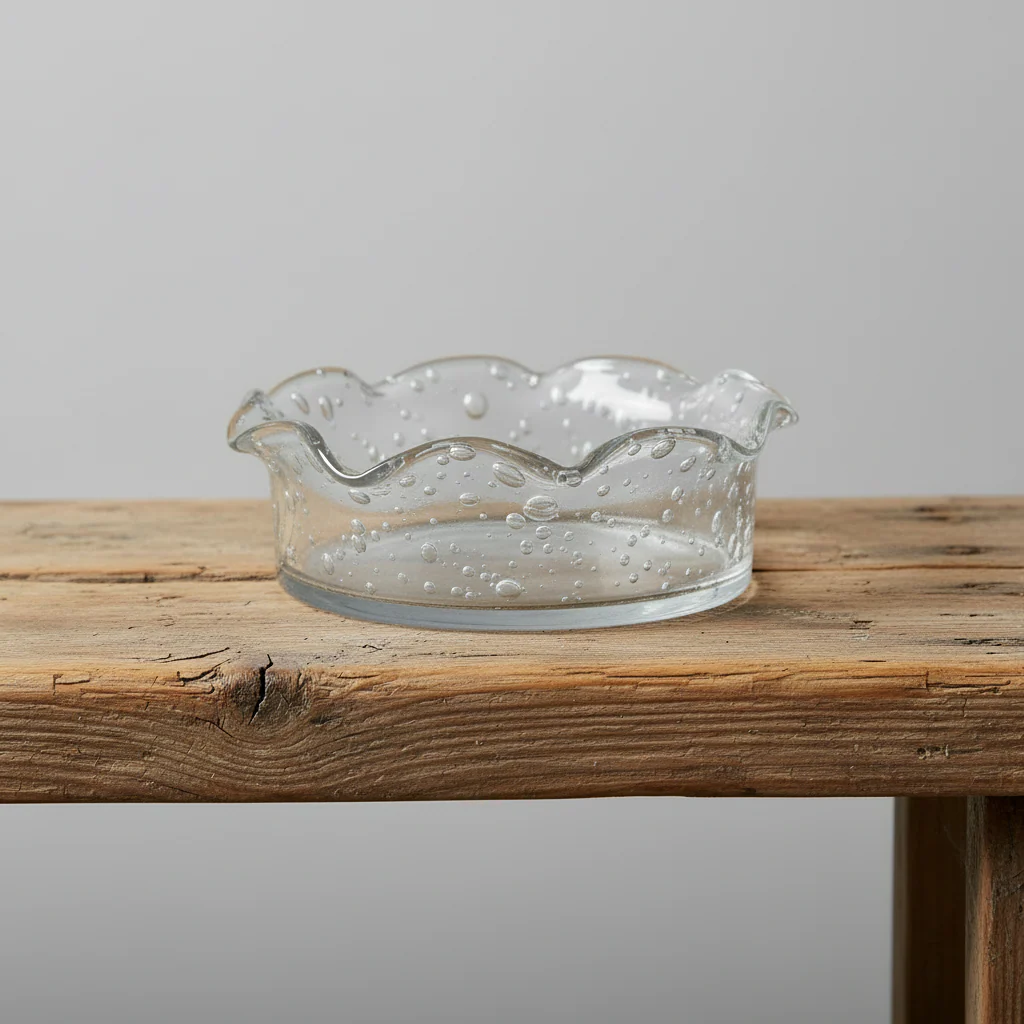 Serien Milla har utökats med denna fina skål i klarglas med en levande, oregelbunden struktur som ger ett mjukt och dekorativt uttryck. Skålen passar lika bra som serveringsskål som en vacker inredningsdetalj på bord eller hylla.