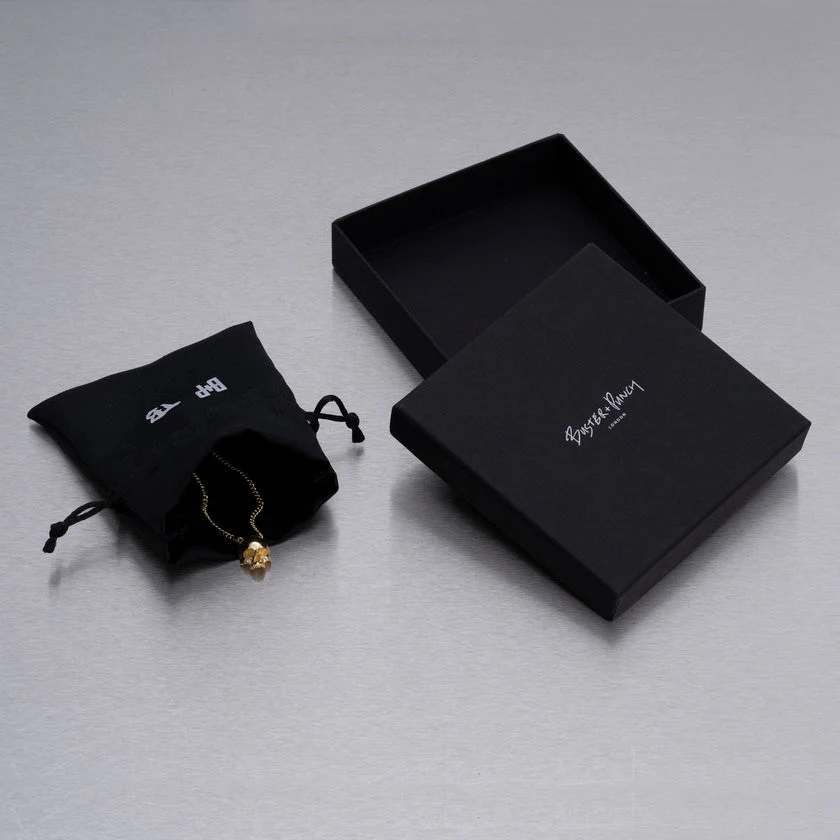 Med Buster + Punchs Skull halsband, designat av Travis Barker, får du ett coolt halsband med ett hänge i form av en dödskalle, guldpläterat. Halsbandet är 45–55 cm