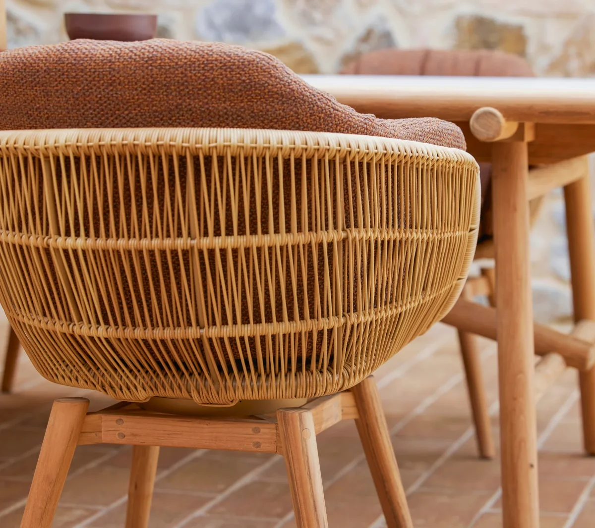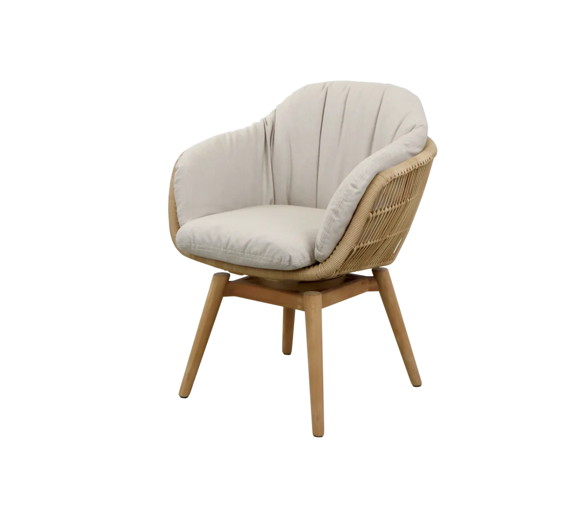 Stolen står på en robust teakbas med en elegant svängbar funktion som kombinerar flexibilitet och stabilitet. De mjuka kuddarna, utrustade med QuickDry & Airflow-systemet, ger enastående komfort och torkar snabbt efter regn.