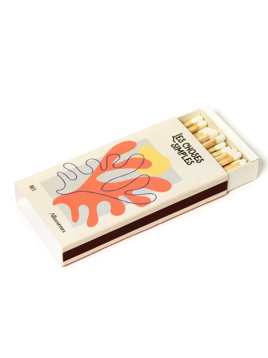 Asken rymmer 43 kvalitativa tändstickor. De är långa och tillverkade av lätt poppelträ med vit spets, formgivna för att ge en säker låga. Den repbara ytan finns placerad längs ena kanten. En liten men genomtänkt inredningsdetalj som lyfter känslan bredvid doftljuset.