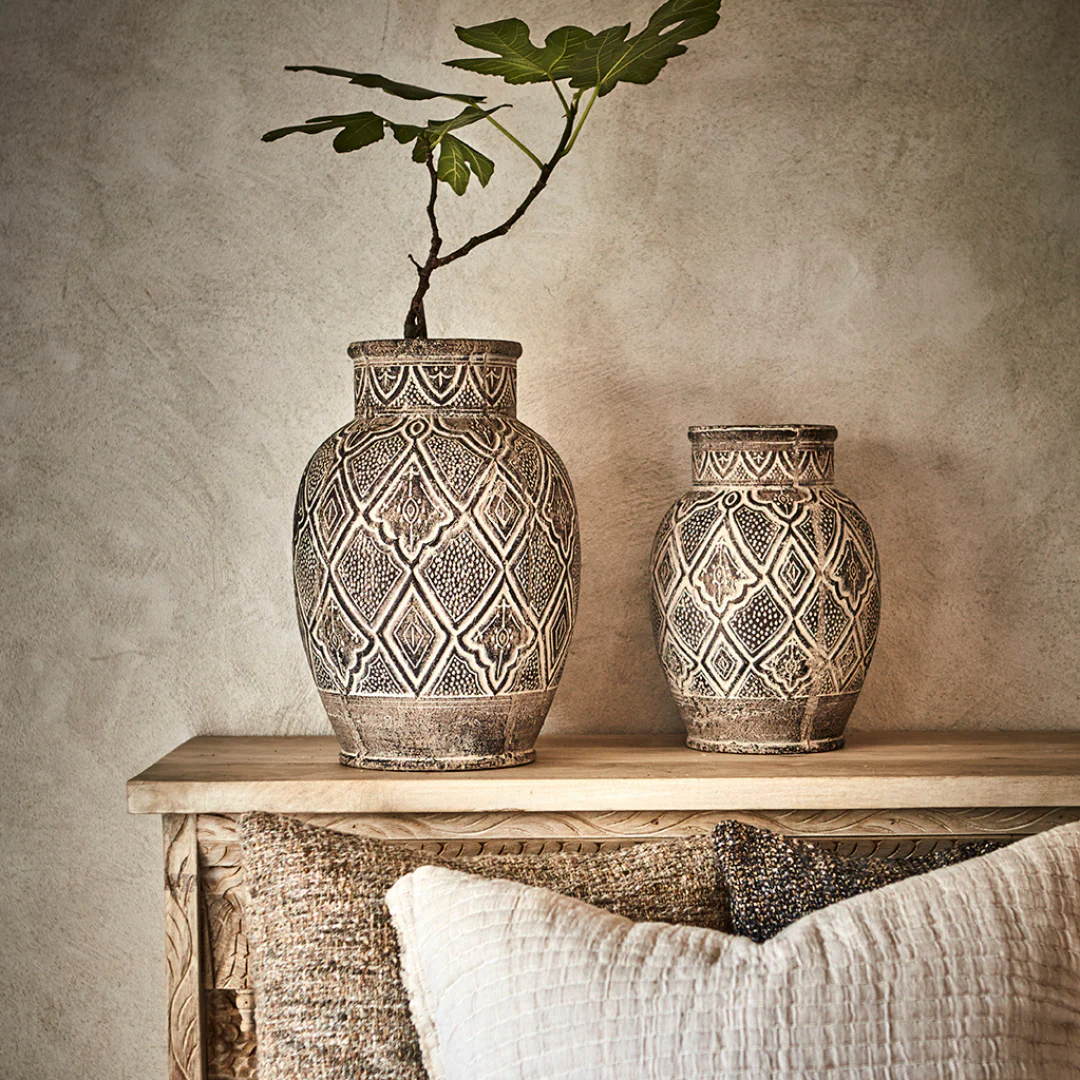 Den varma, naturliga tonen i terrakottan skapar en inbjudande atmosfär i hemmet, medan det detaljerade mönstret tillför en exotisk touch.