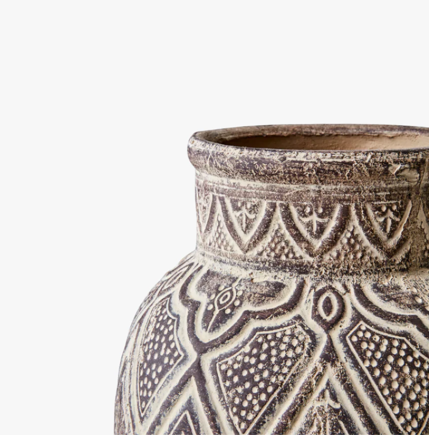 Urna Camille är en vacker urna i ljusbrun terrakotta, prydd med ett spännande marockanskinspirerat mönster som ger en känsla av hantverk och tradition.