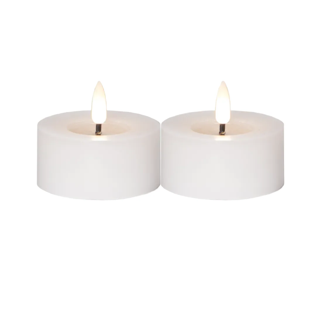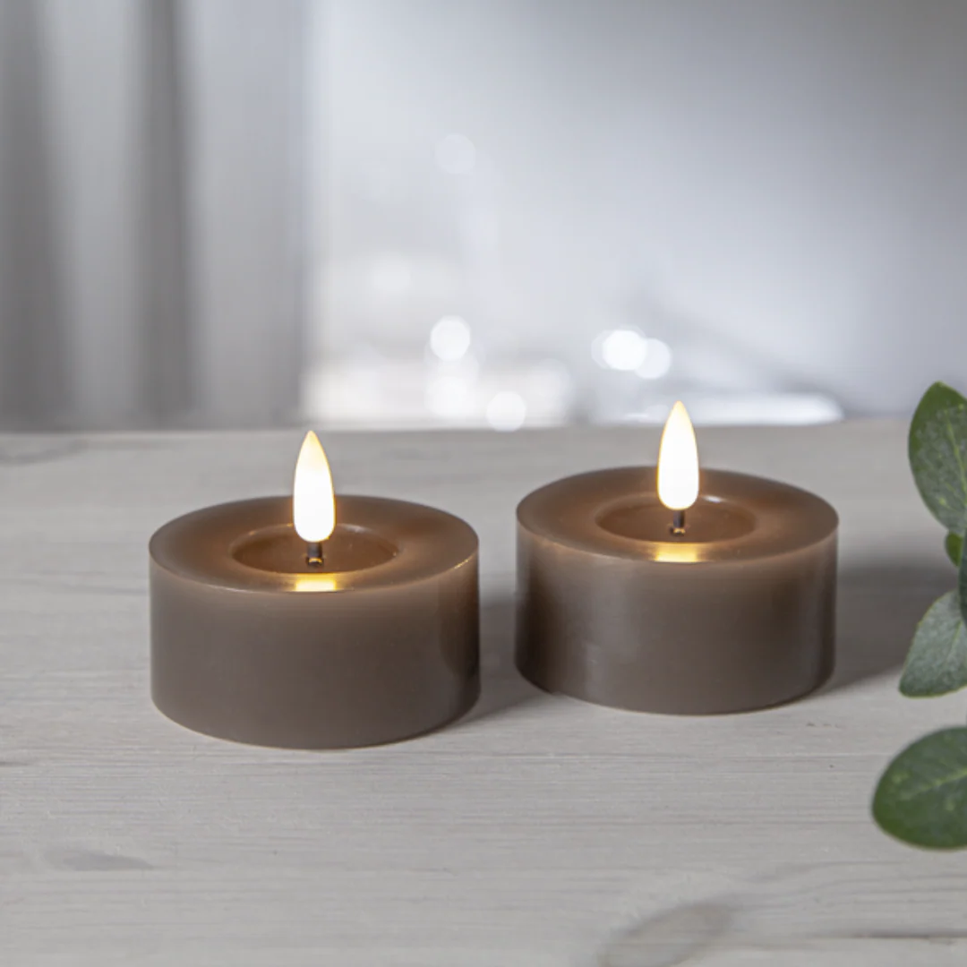 Verklighetstrogna Värmeljus i vax med en låga som ger ett naturtrogen sken och utseende.. Skapar ett mysigt och behagligt sken inomhus.